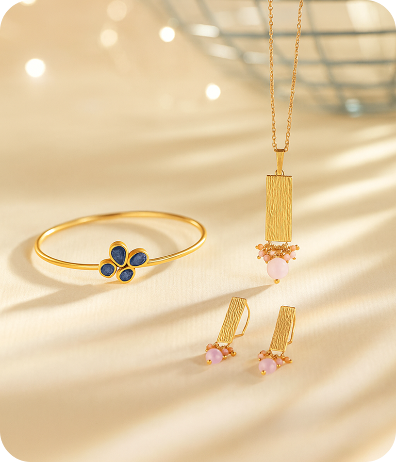 +Elaara jewellery is crafted from premium 925 sterling silver with double 18K gold plating, adorned with high-quality gemstones.