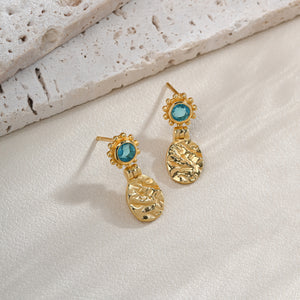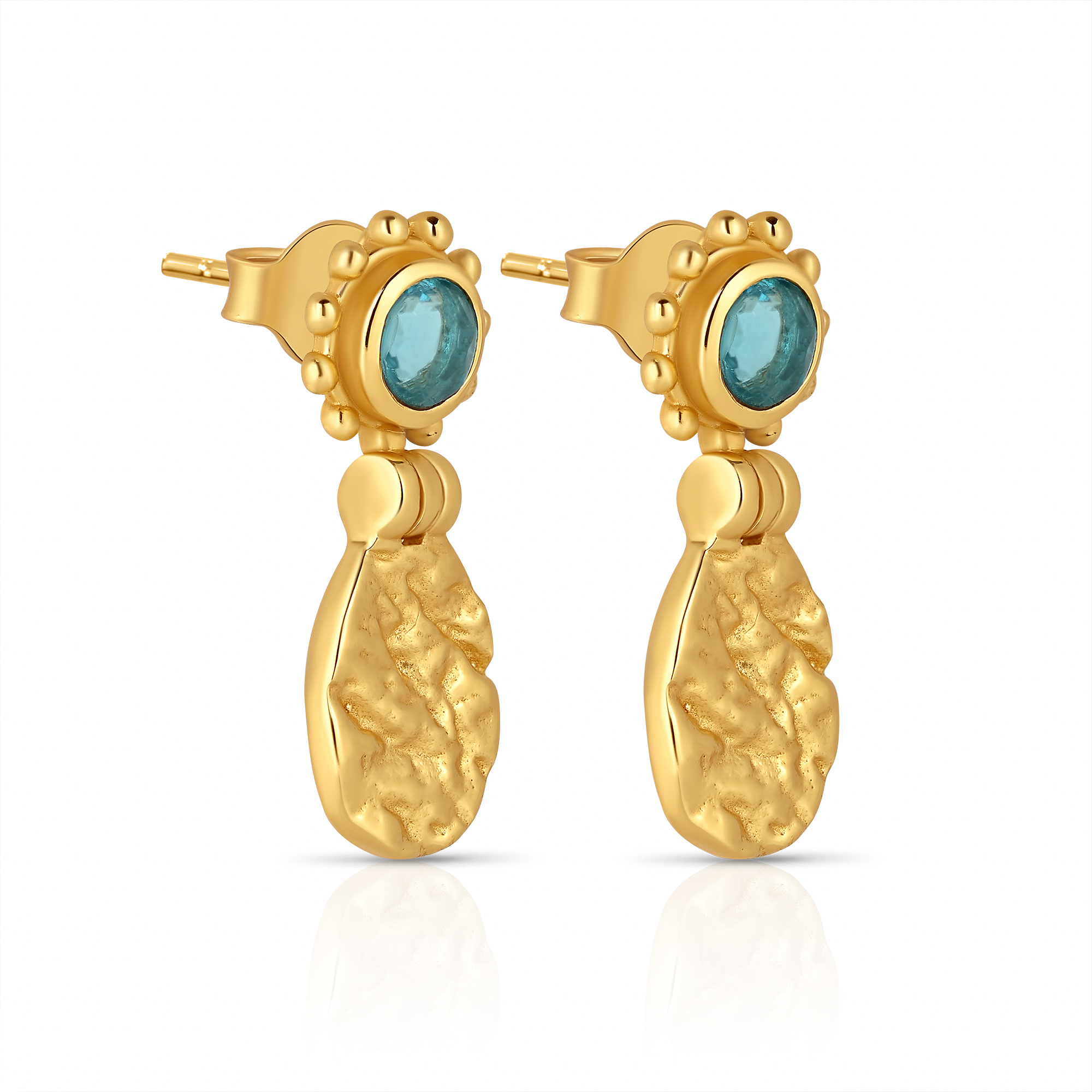 18K 925 sterling silver, gold-plated. Features natural apatite gemstones in a graceful drop silhouette.