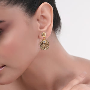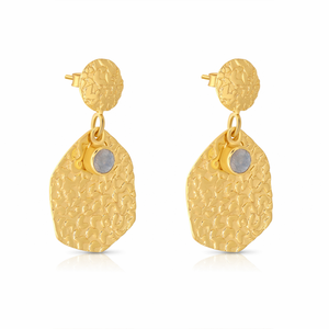 Featuring a bold hammered gold disc and a soft rainbow moonstone, Sunhammer Drops blend raw texture with celestial glow. Crafted in 18k gold-plated sterling silver for effortless elegance.