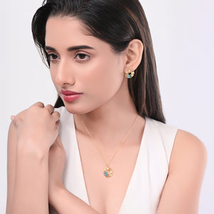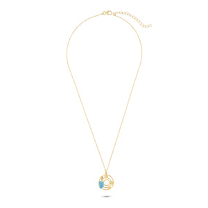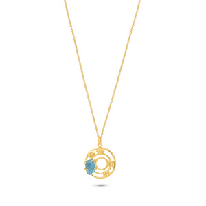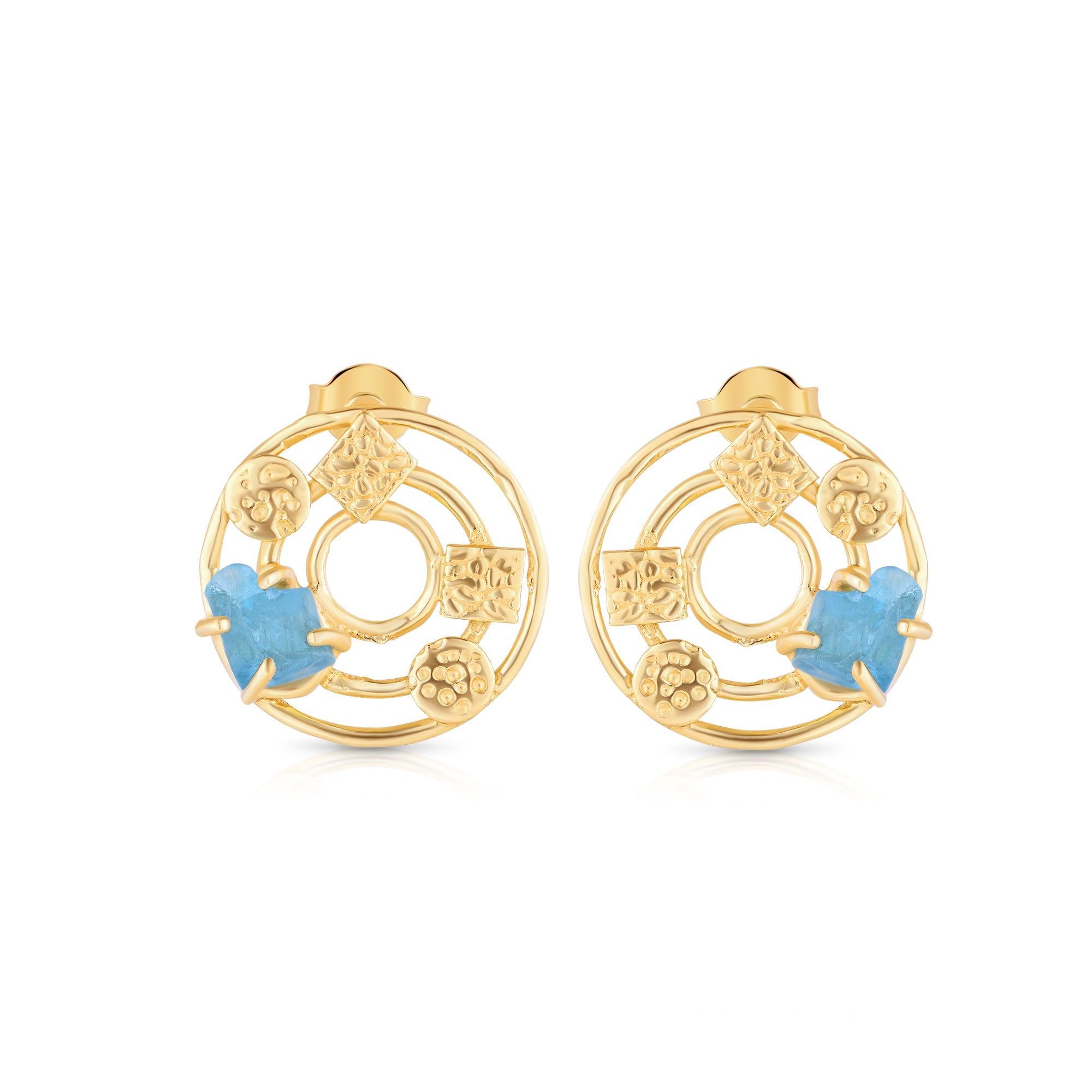 A raw apatite stone wrapped in oceanic blue netting hangs alongside a textured gold disc, capturing the spirit of wild seas and grounded calm. Crafted in 18k gold-plated sterling silver,