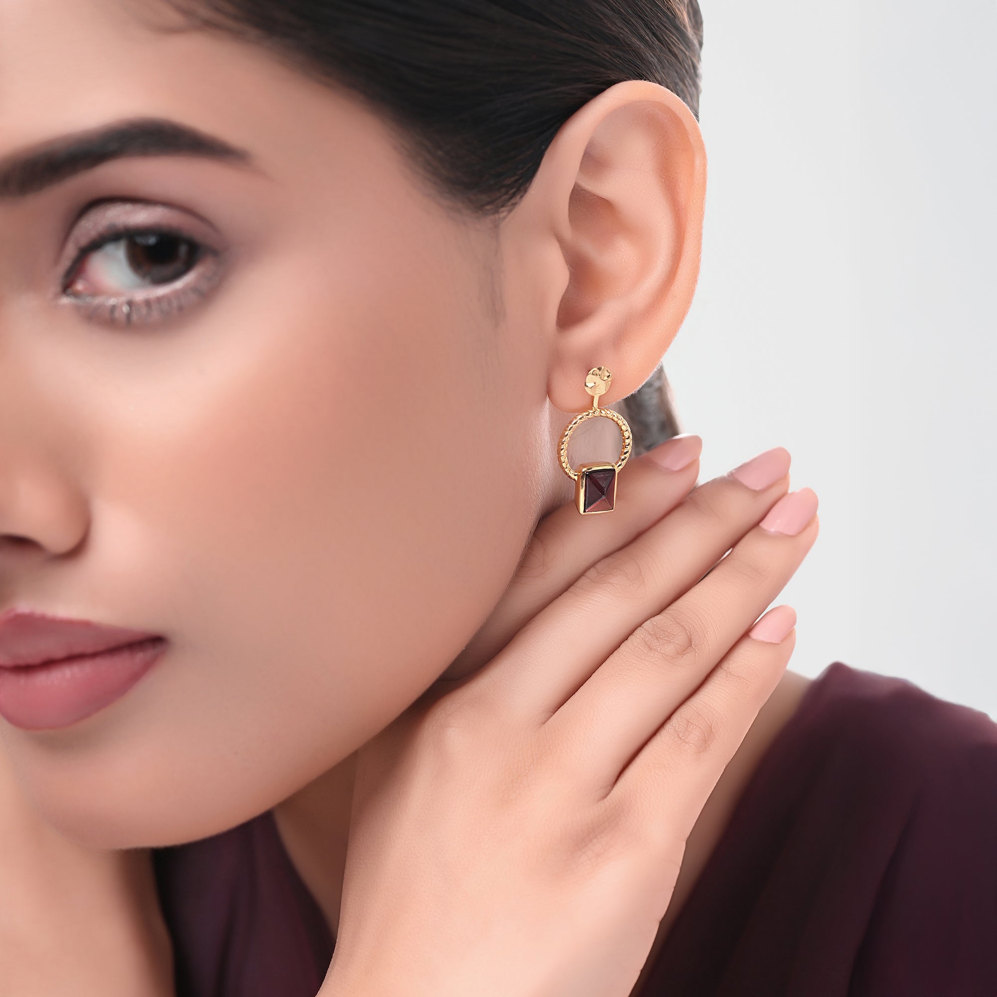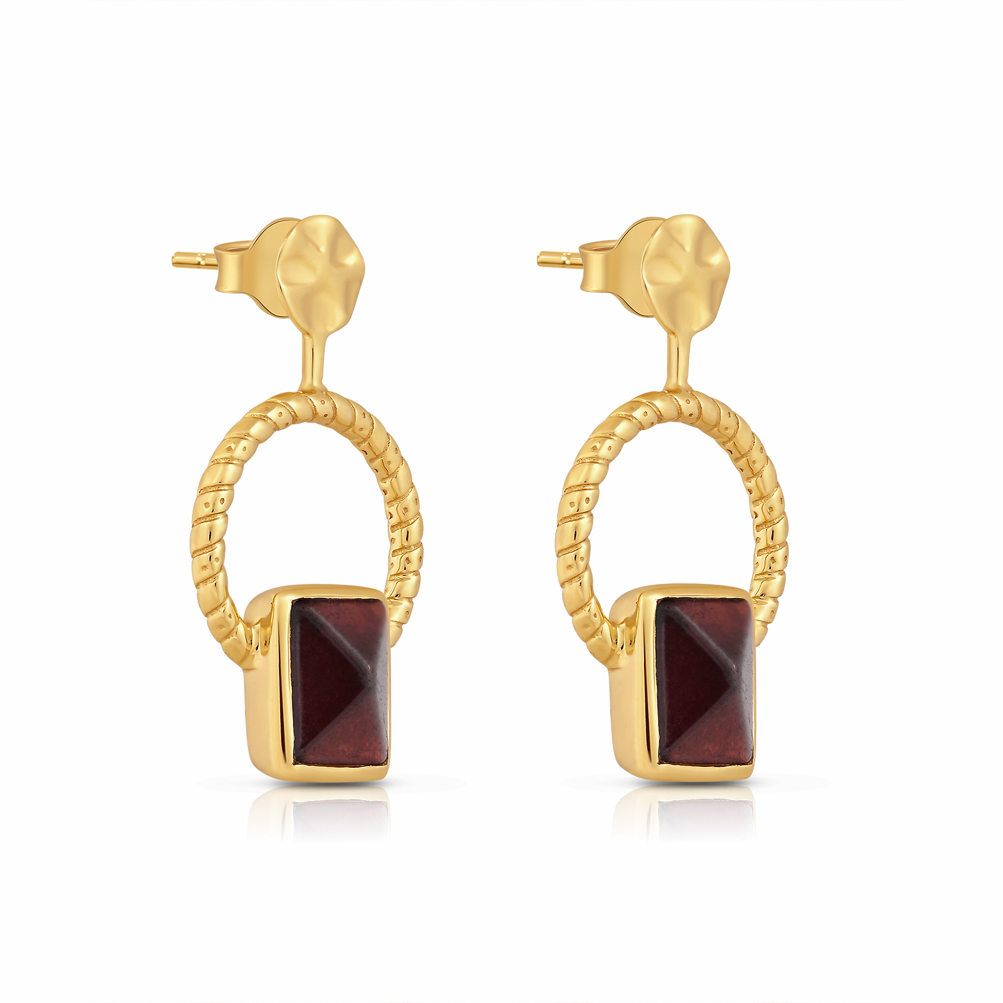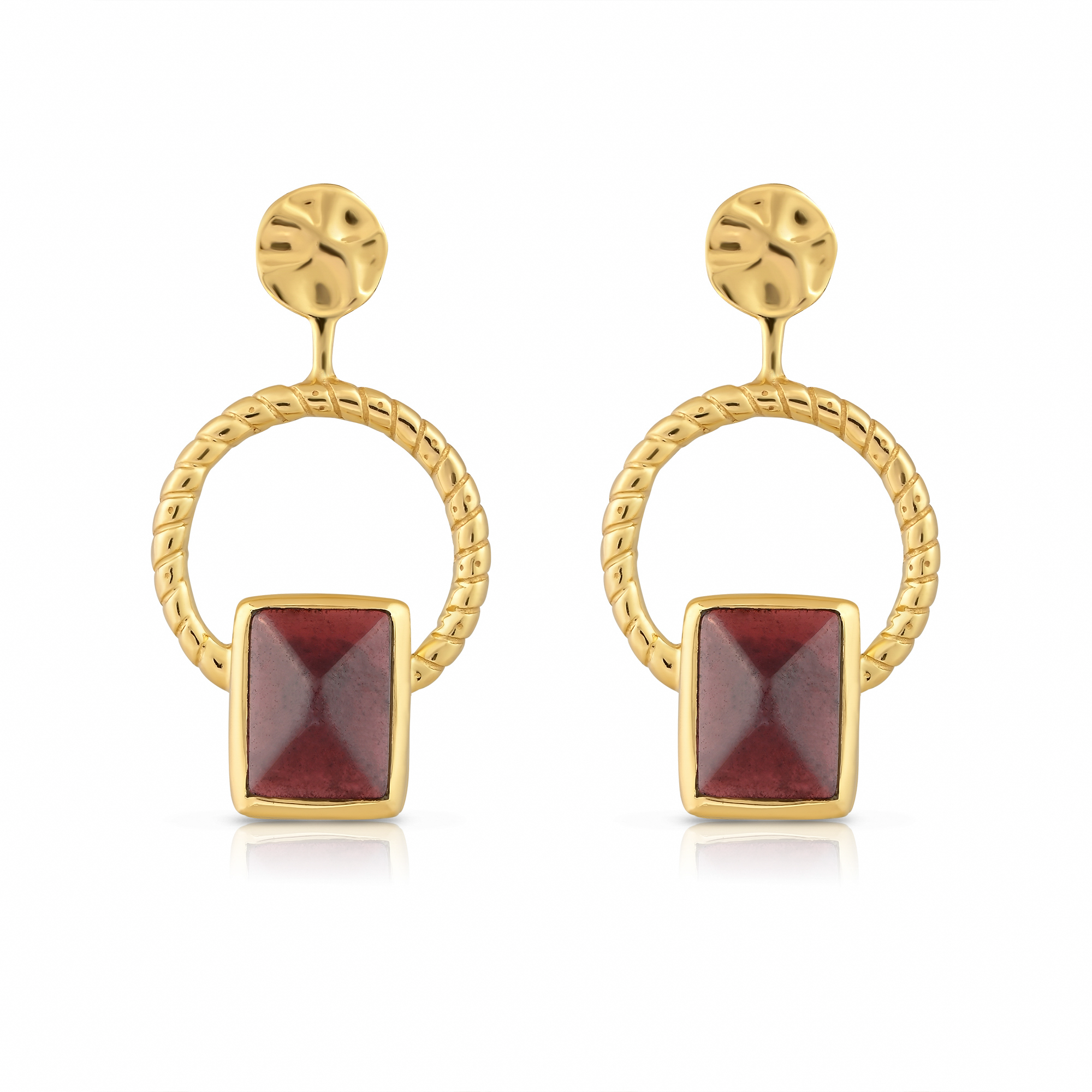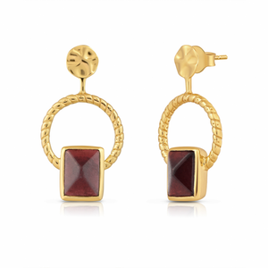 Crafted in luminous 18K sterling silver, these hoops showcase a radiant garnet centerpiece surrounded by a delicately textured halo