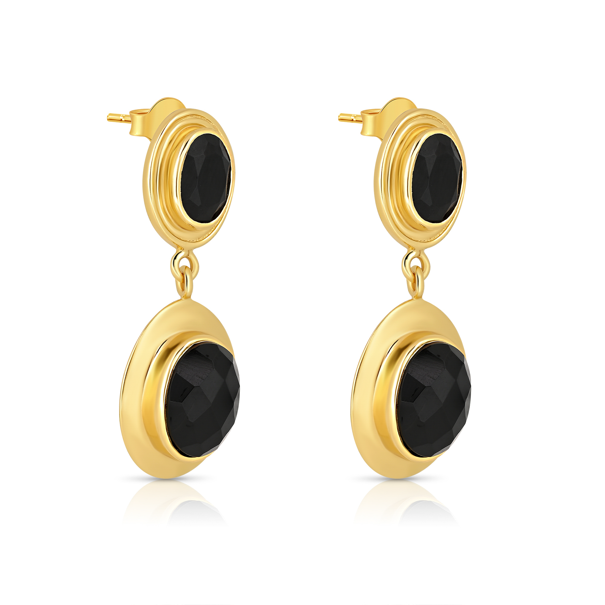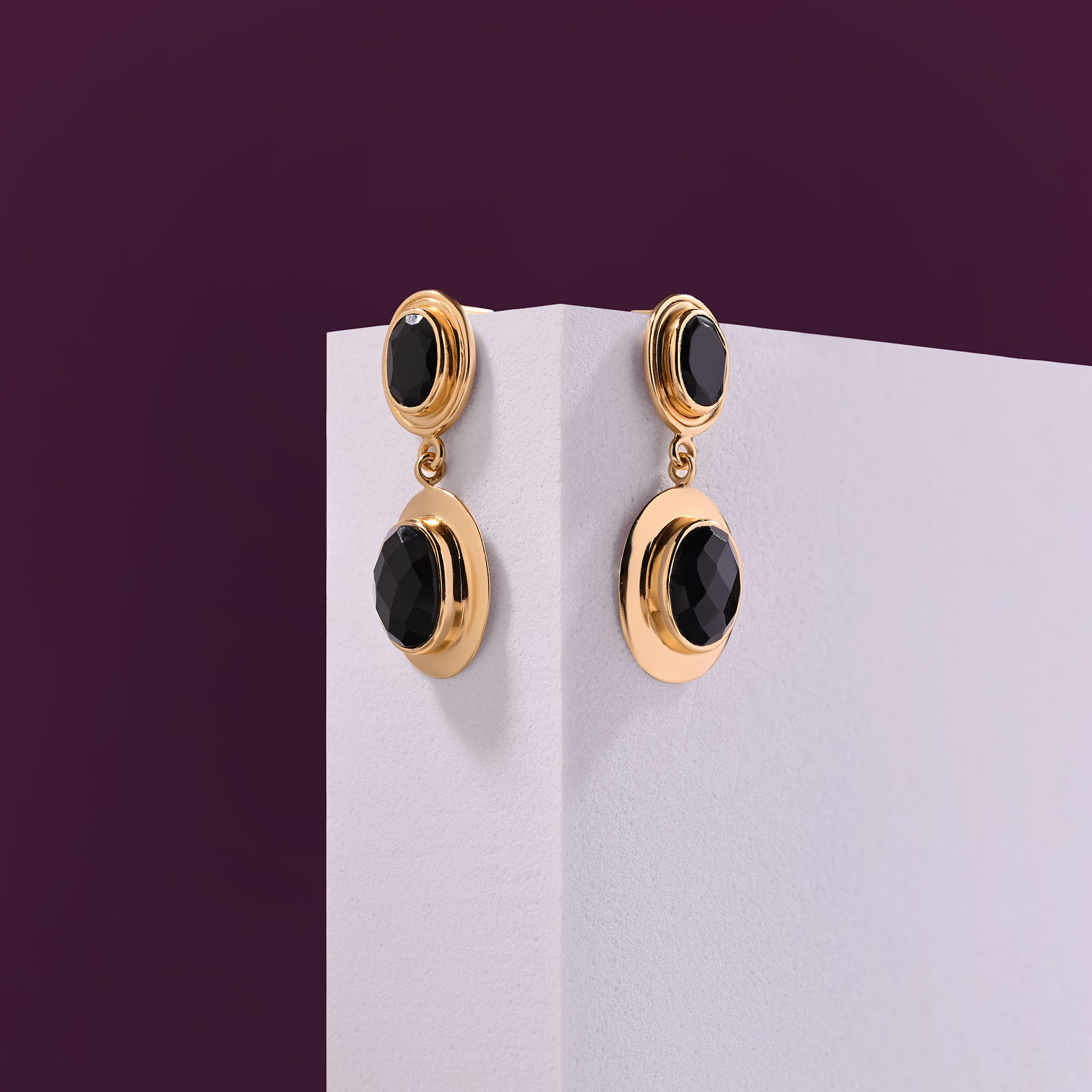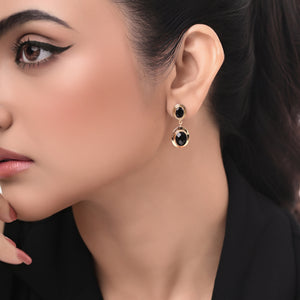 Inspired by the celestial beauty of nightfall, these dual black stone earrings radiate moody glamour in 18k gold plating.