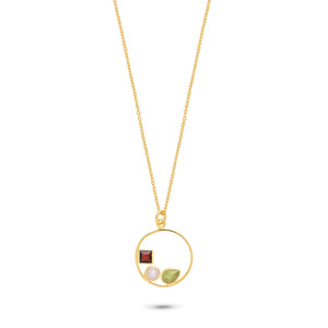 Crafted in sterling silver with an 18k gold plating, this pendant showcases a trio of radiant gemstones—garnet, peridot, and moonstone—arranged in a circle of elegance, evoking the beauty of a divine garden in bloom.