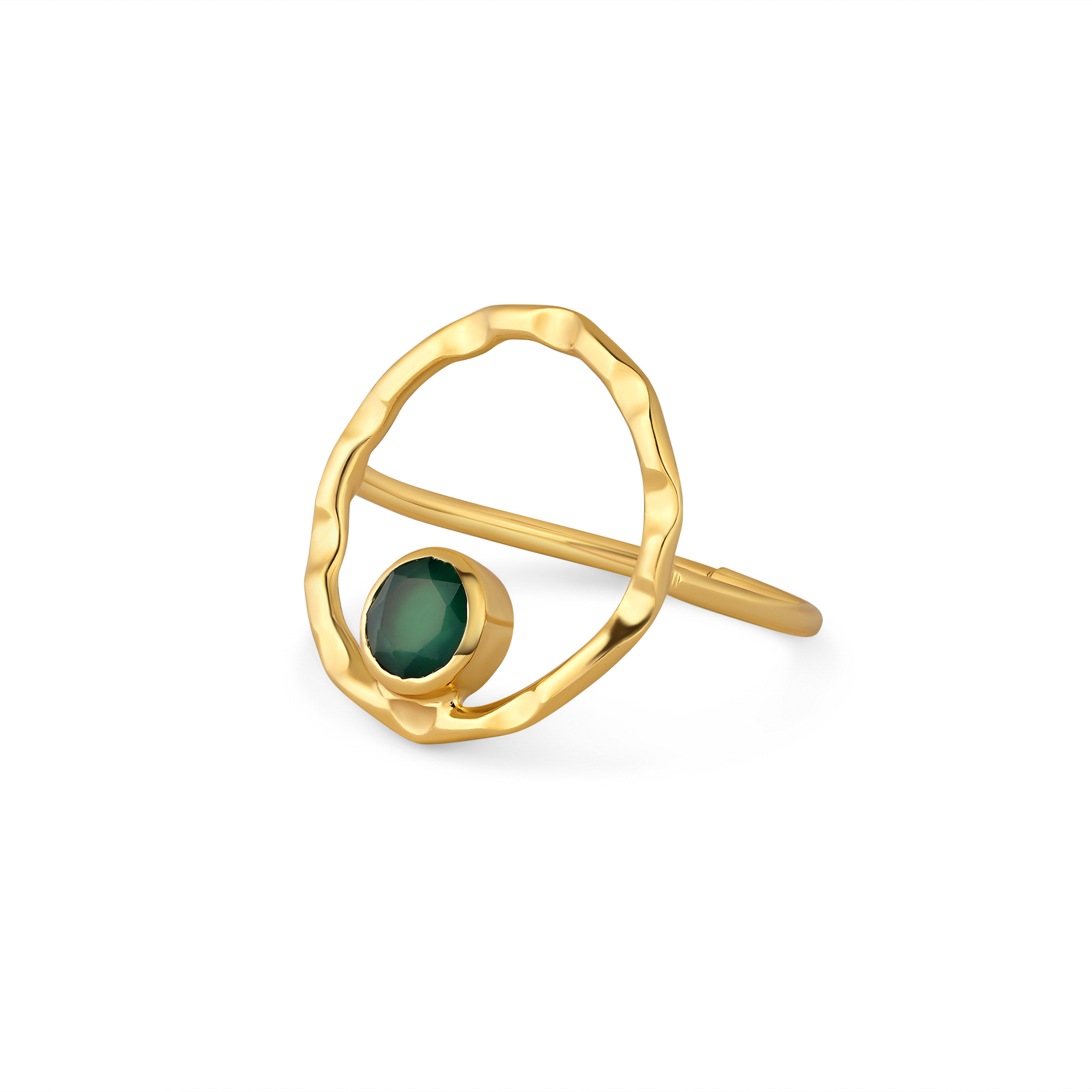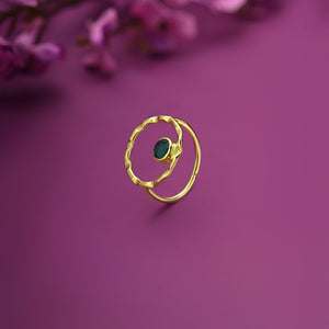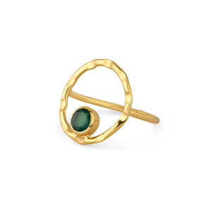 18k gold-plated ring showcasing a deep green onyx encased in a delicate halo, inspired by nature’s serene beauty.