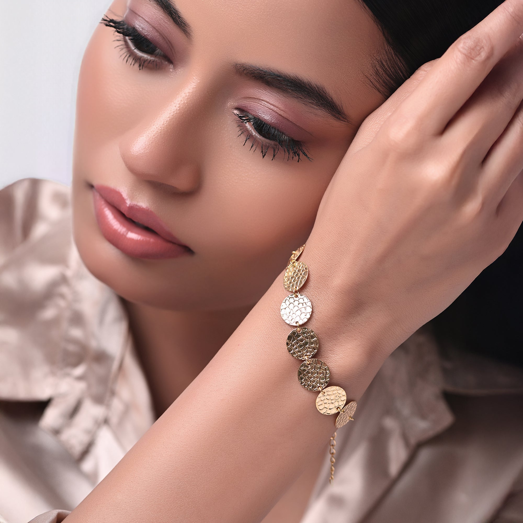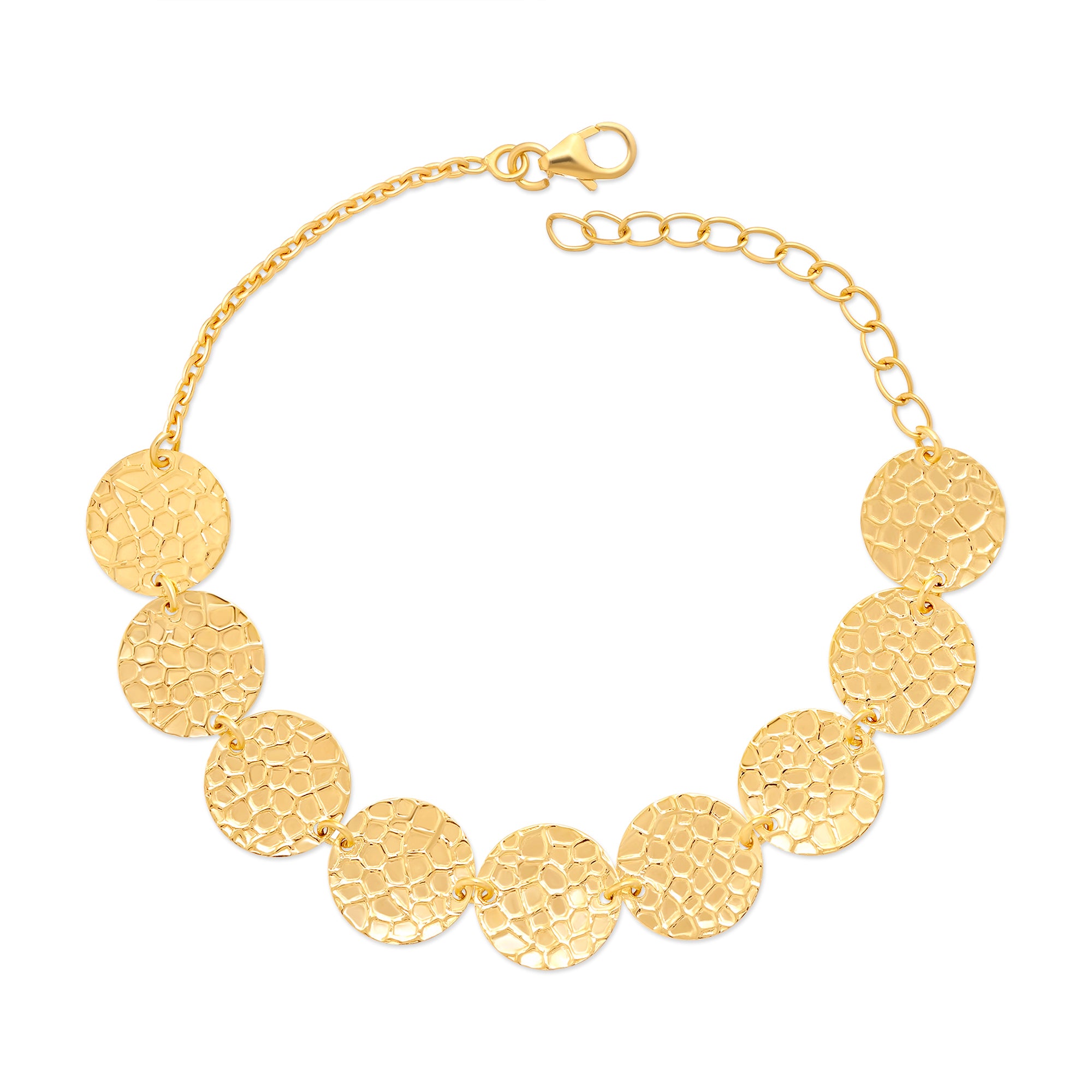 This striking bracelet in 18k gold plated sterling silver features multiple interconnected gold-tone discs with a captivating textured, scale-like finish, creating a bold yet elegant look.