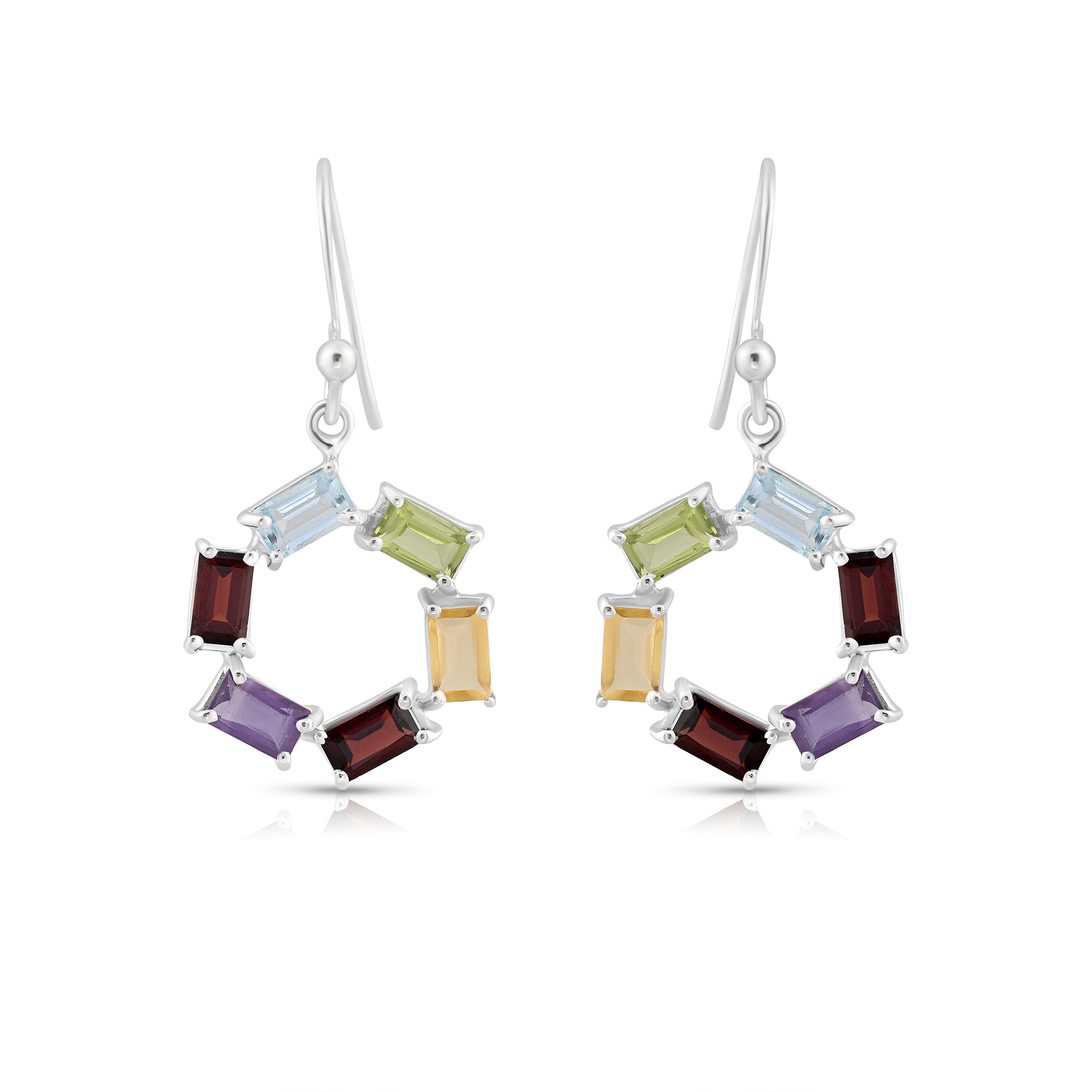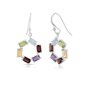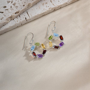 Circular silver hoops adorned with a vibrant array of multicolored stones, capturing the dynamic beauty of a kaleidoscope