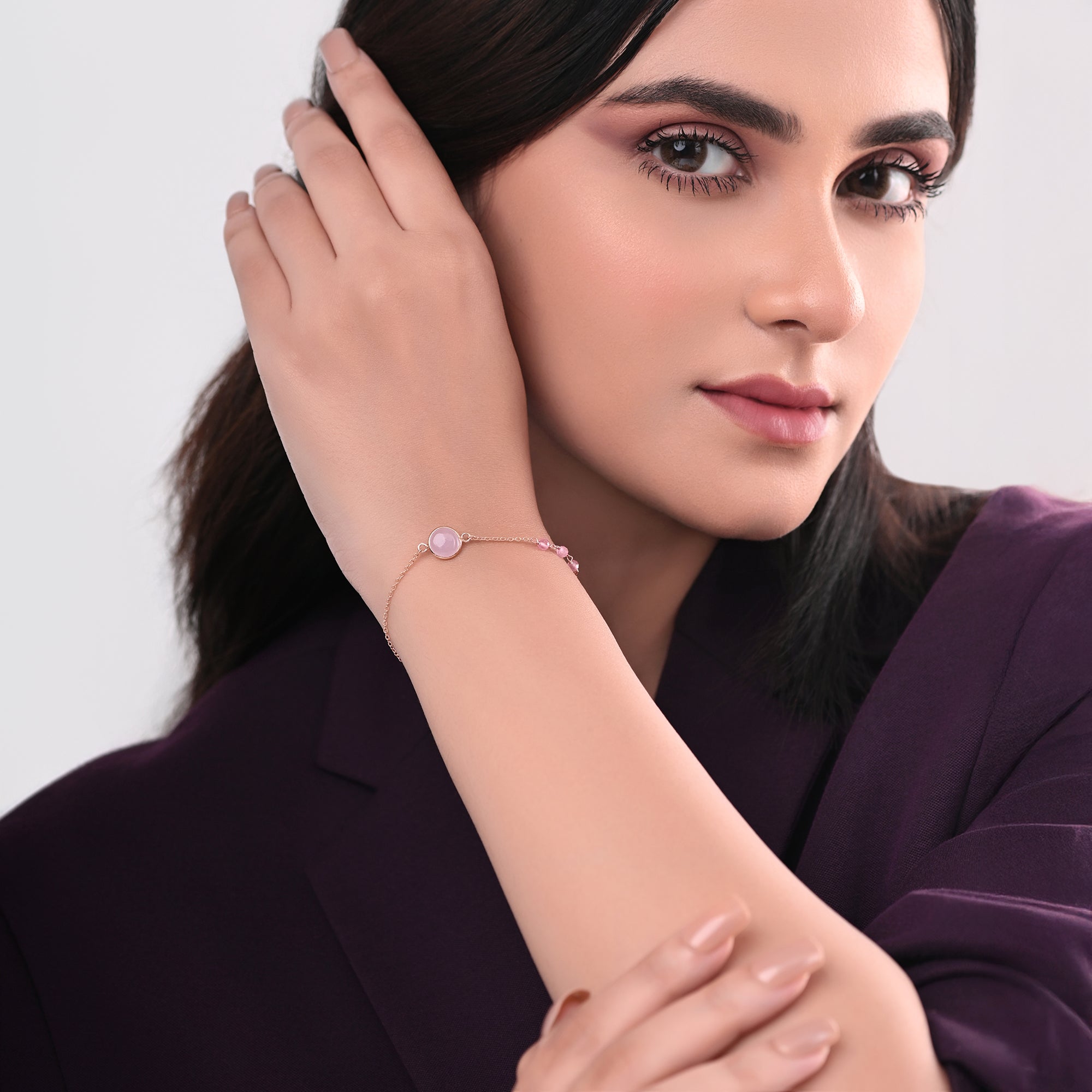 Adorn your wrist with this enchanting bracelet, crafted from 18k gold-plated sterling silver. It features a delicate chain accented with sparkling clear stones and a central purple amethyst, complemented by a charming, intricate knot dangle.
