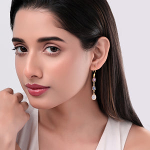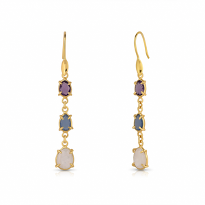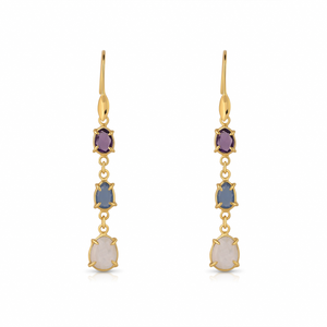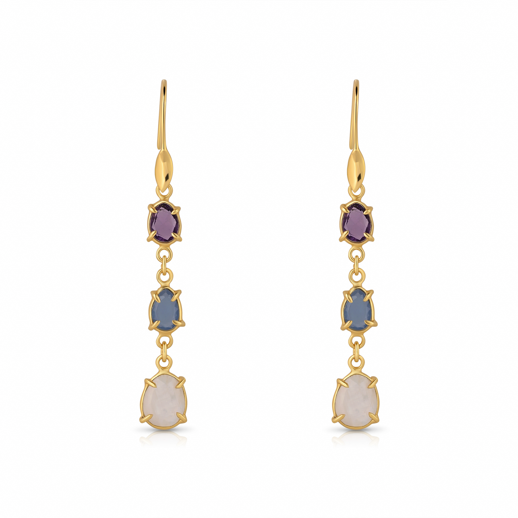 Enchanting danglers that blend the rich purple of amethyst, the soothing blue chalcedony, and the ethereal shimmer of rainbow moonstone. Crafted in 18K gold-plated sterling silver