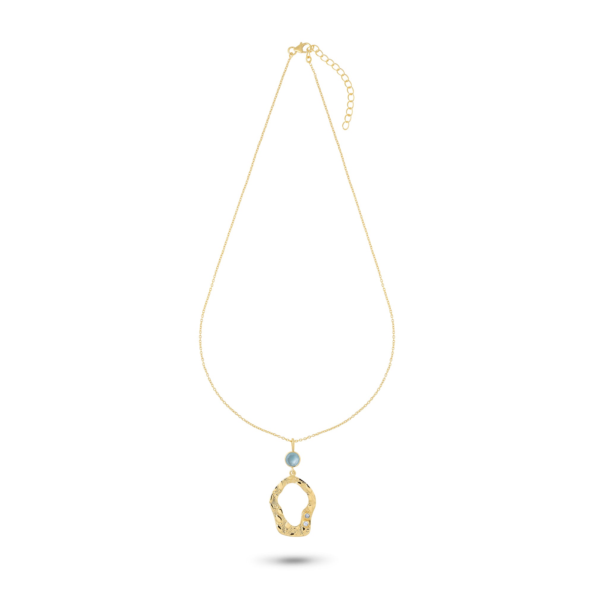 A modern statement set crafted in 925 sterling silver with rich gold plating, featuring a textured open-form pendant adorned with a soft aqua blue stone and subtle blue topaz accents.