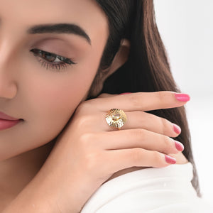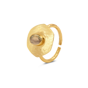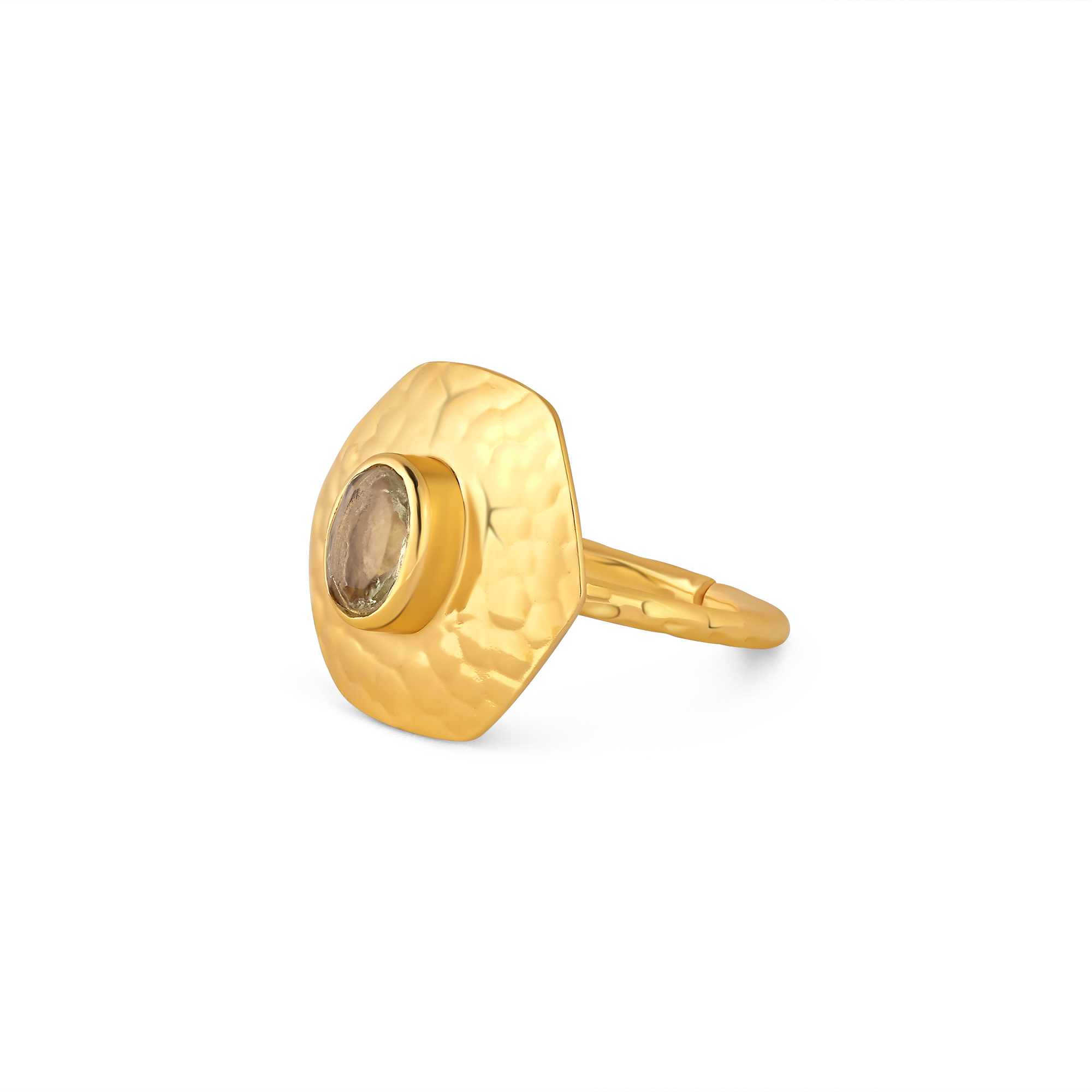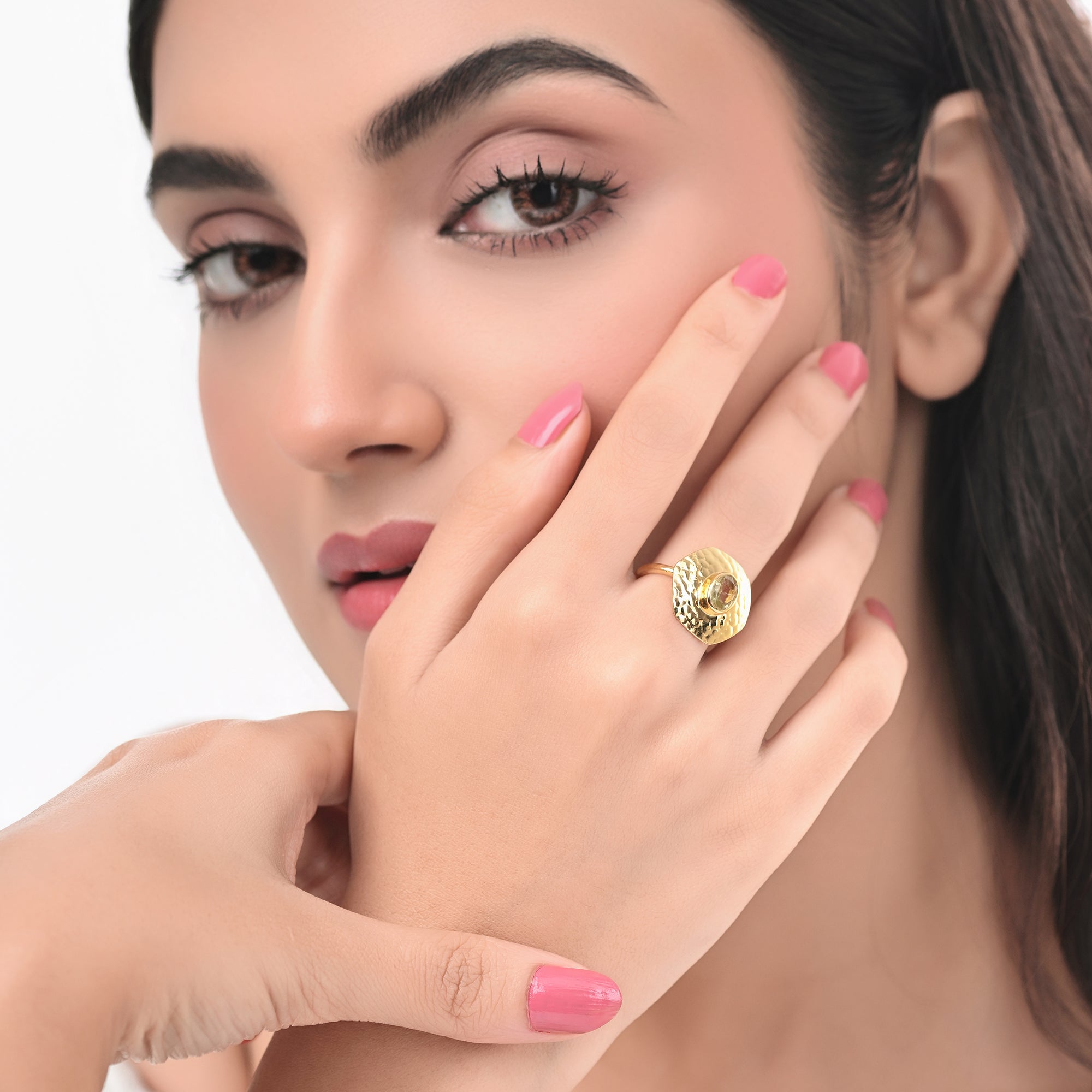18k gold-plated circle anchored by a lemon quartz center, offering a balance of artisanal edge and refined shine.