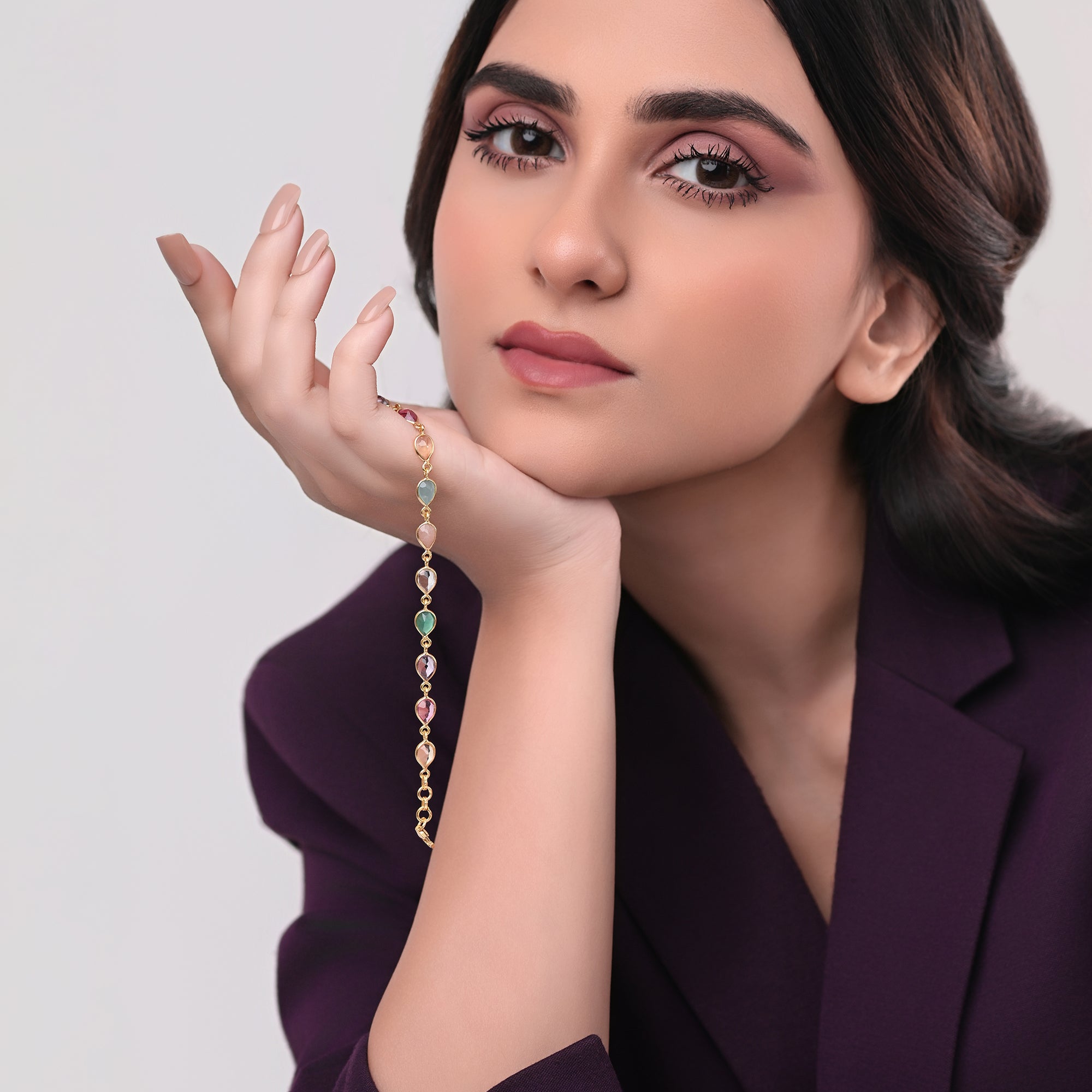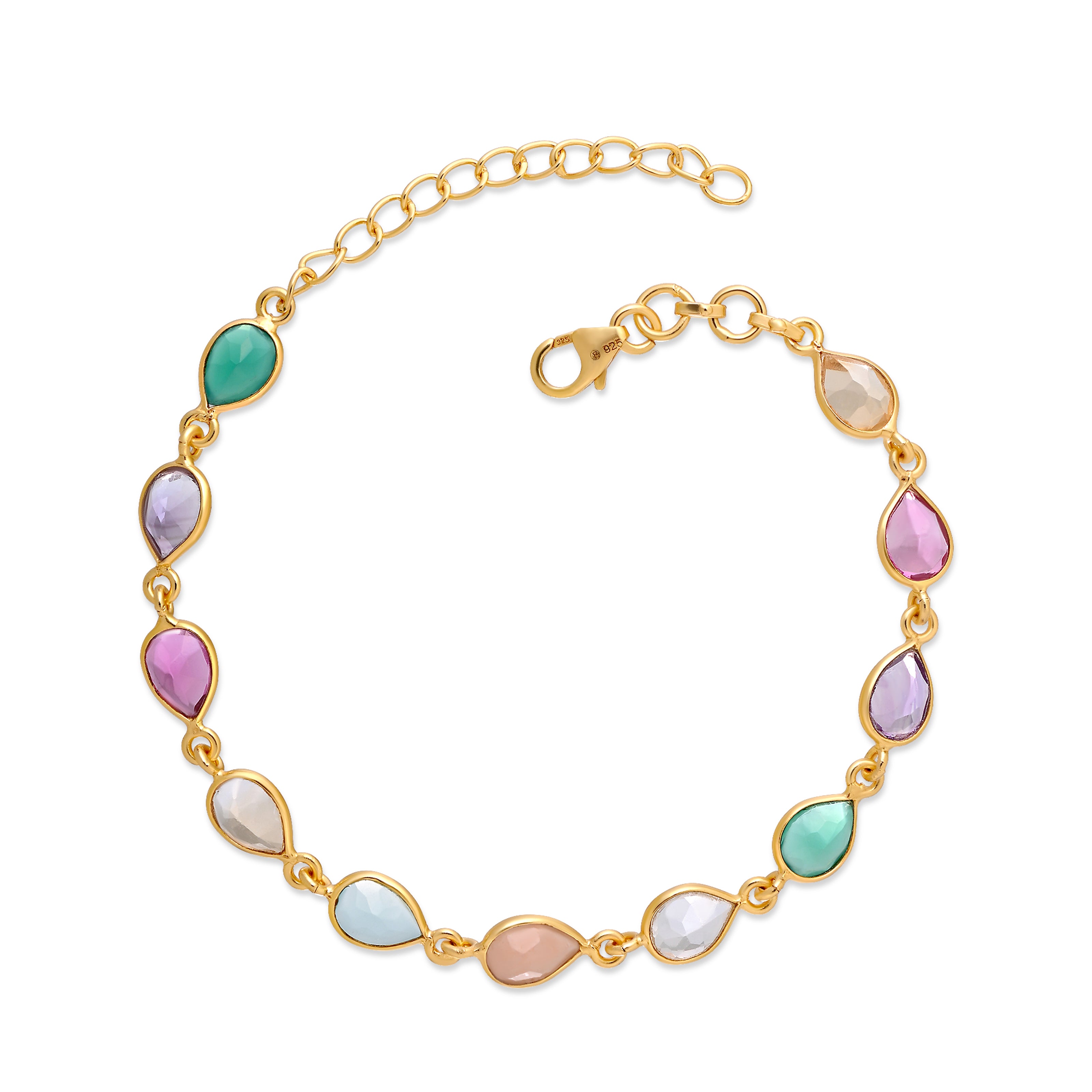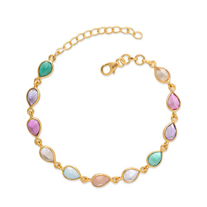 Adorn your wrist with a vibrant splash of color. This delightful bracelet features a delicate 18k gold-plated sterling silver chain intricately set with an array of faceted, multicoloured gemstones in various playful shapes, creating a beautiful cascade of hues.