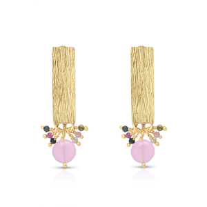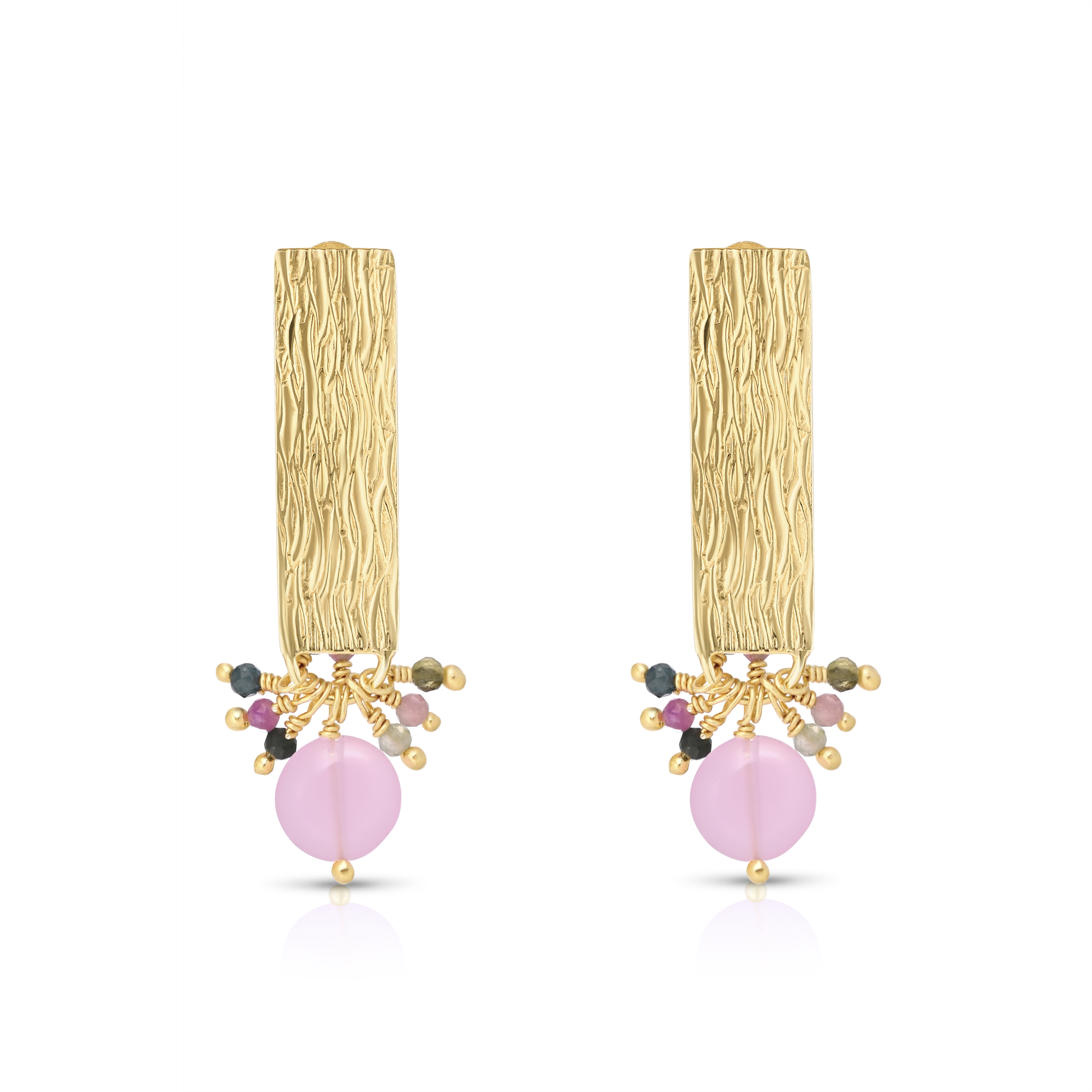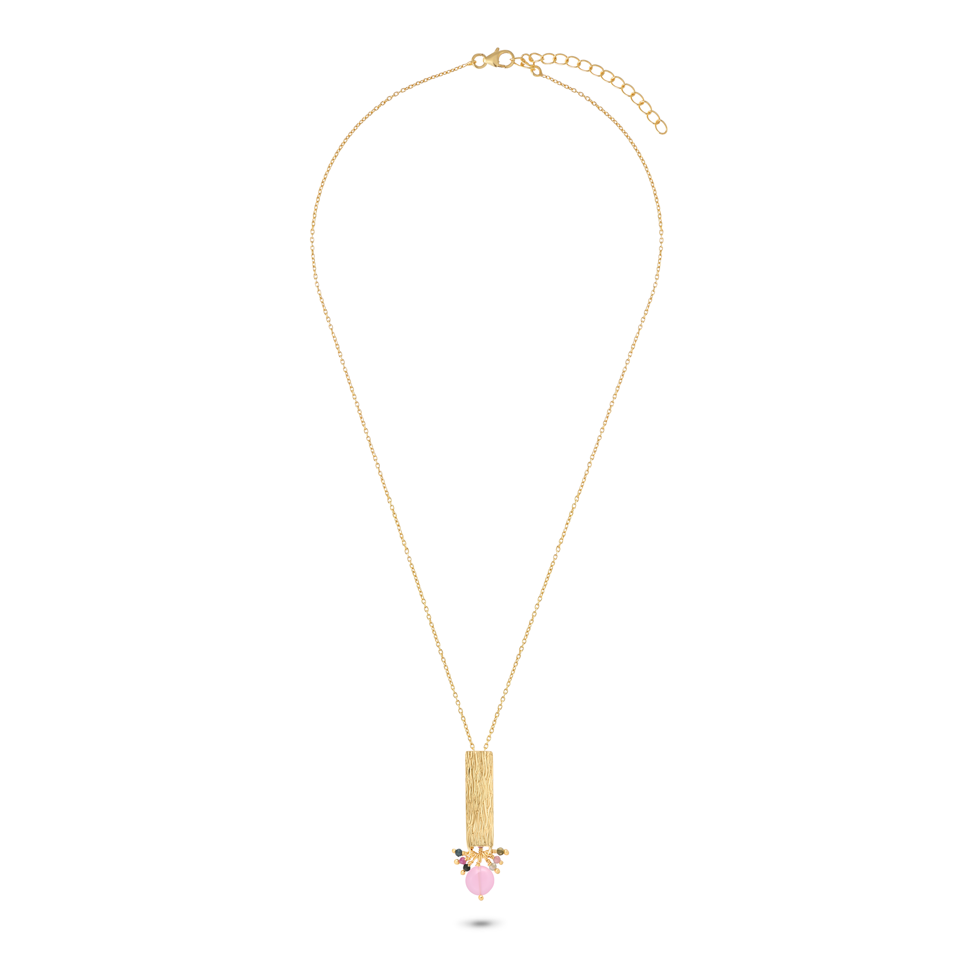 A graceful fusion of structure and softness, this pendant set showcase textured 18k gold-plated 925 sterling silver vertical bars paired with dainty rose chalcedony and tourmaline beads.