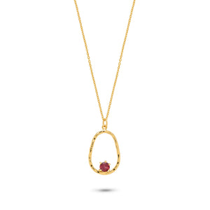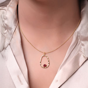 This pendant frames a deep garnet at its heart within a delicate pearl-shaped gold wire. Handcrafted in 925 sterling silver with 18K gold plating