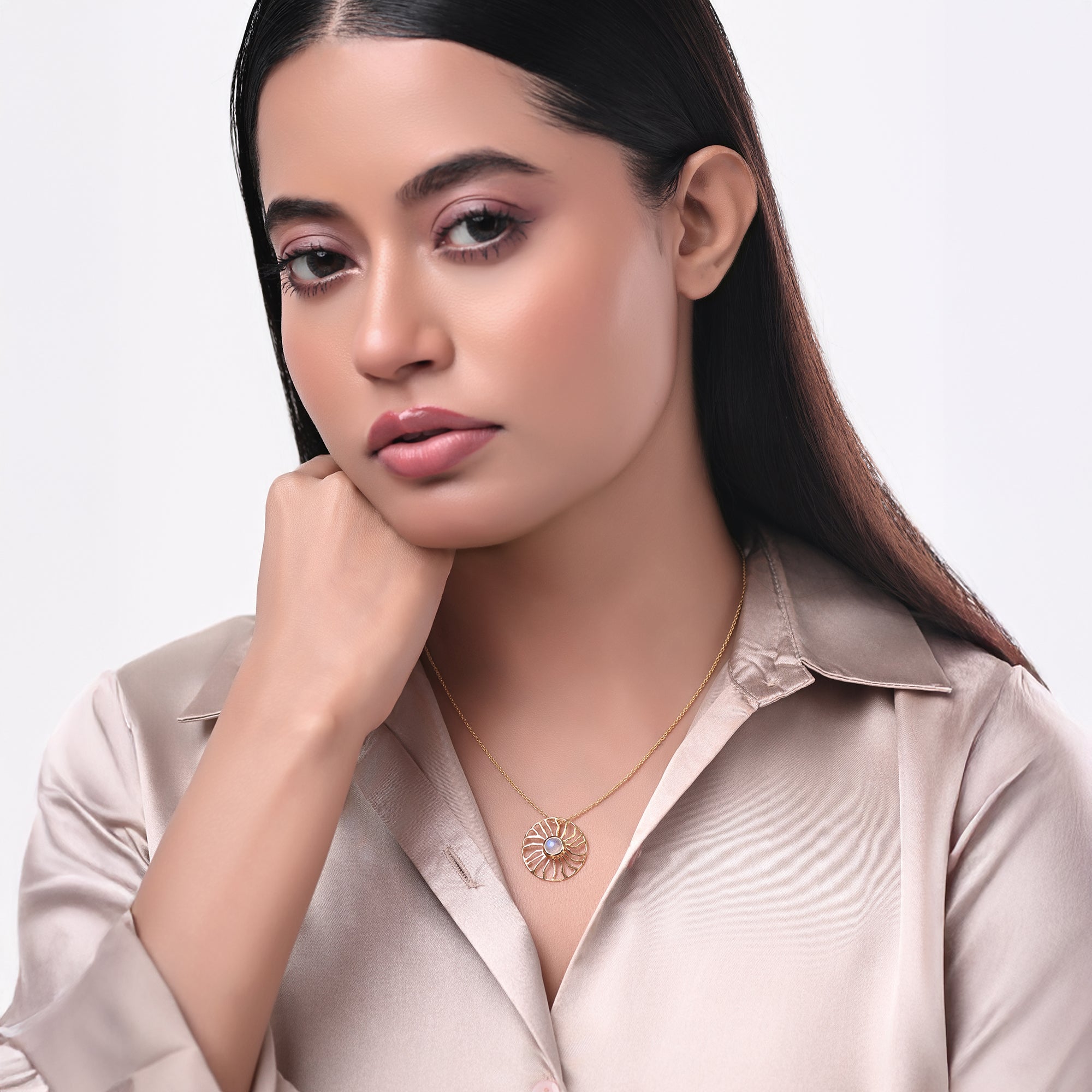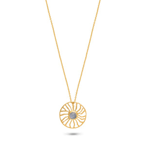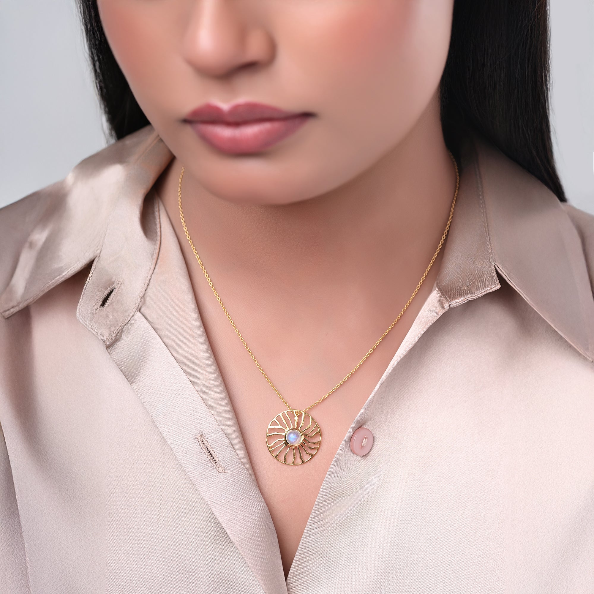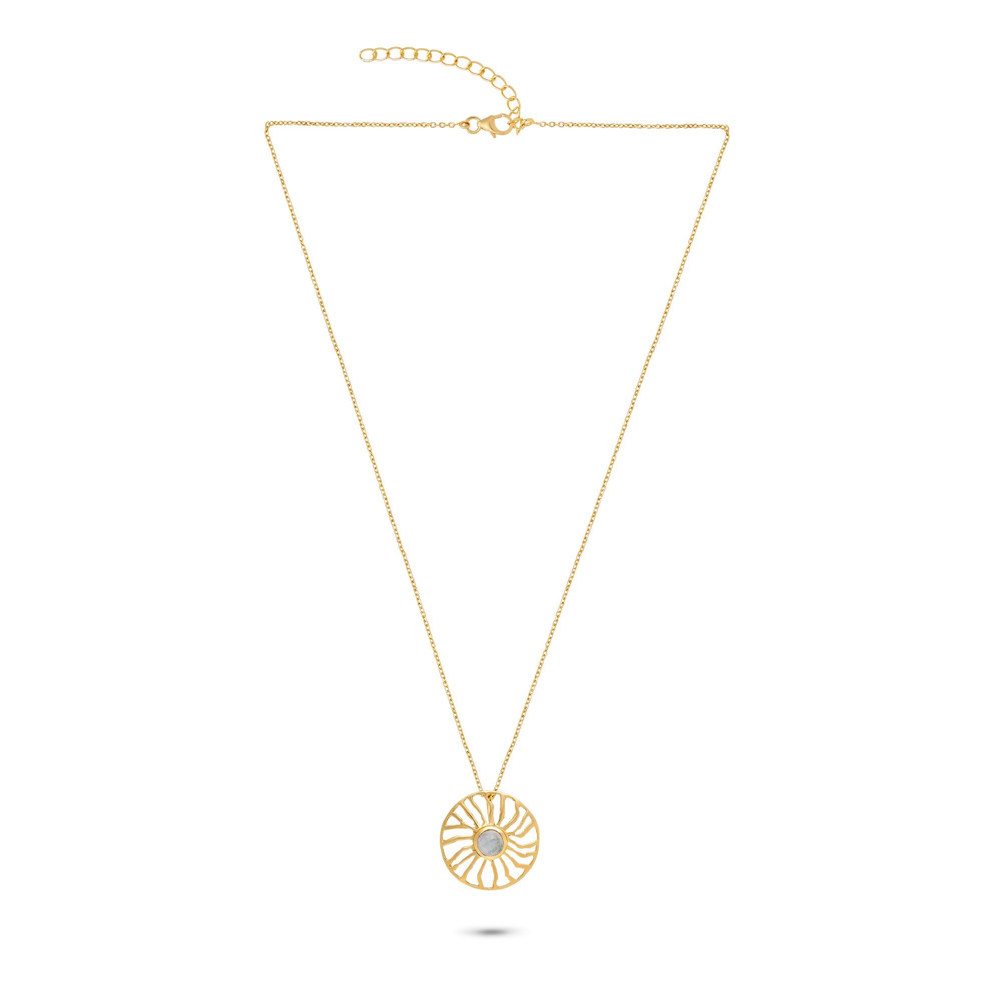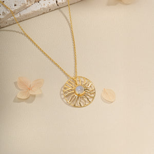 Rainbow moonstone and gemstones set in 18K gold-plated sterling silver, framed by radiant sunrays in a circular design for a subtle celestial glow.