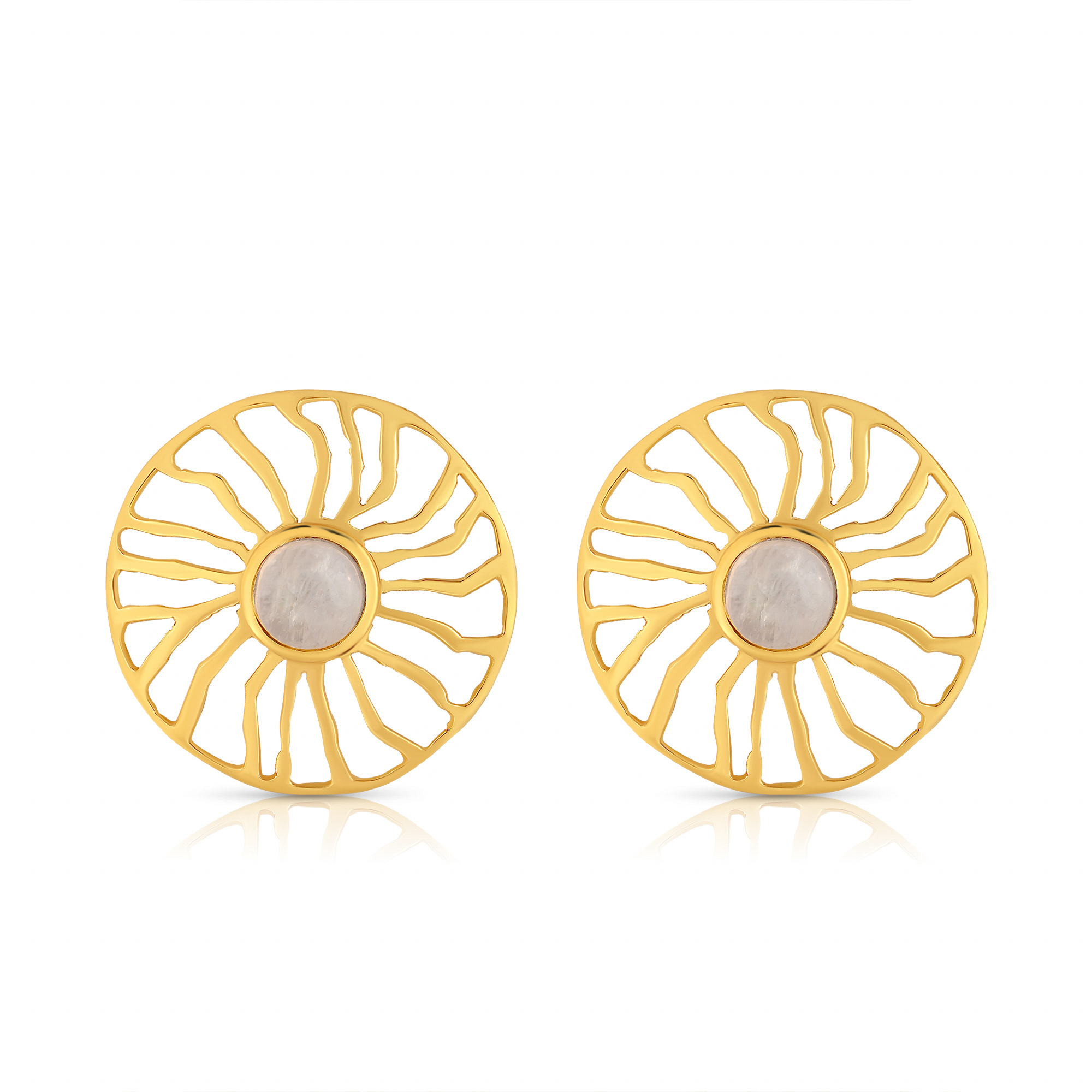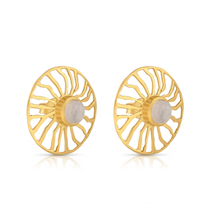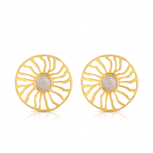 Rainbow moonstone and gemstones set in 18K gold-plated sterling silver, framed by radiant sun rays in a circular design for a subtle celestial glow.
