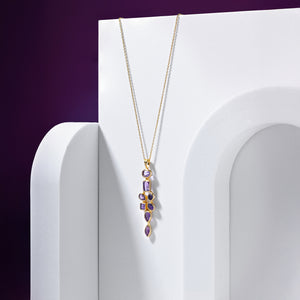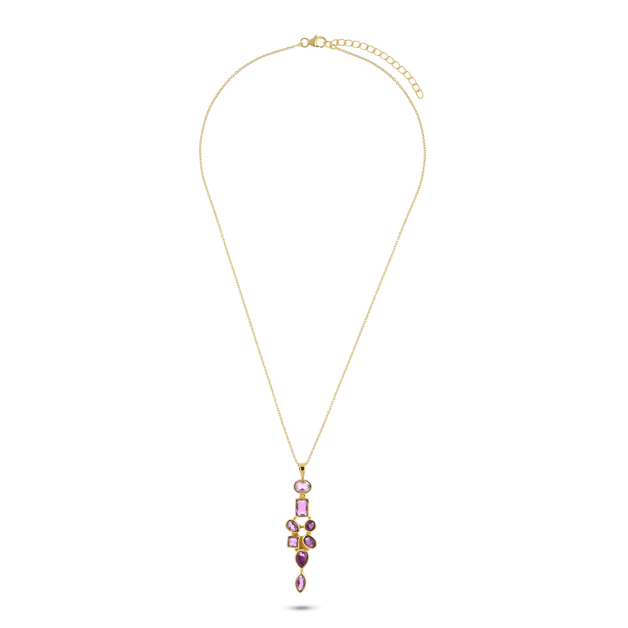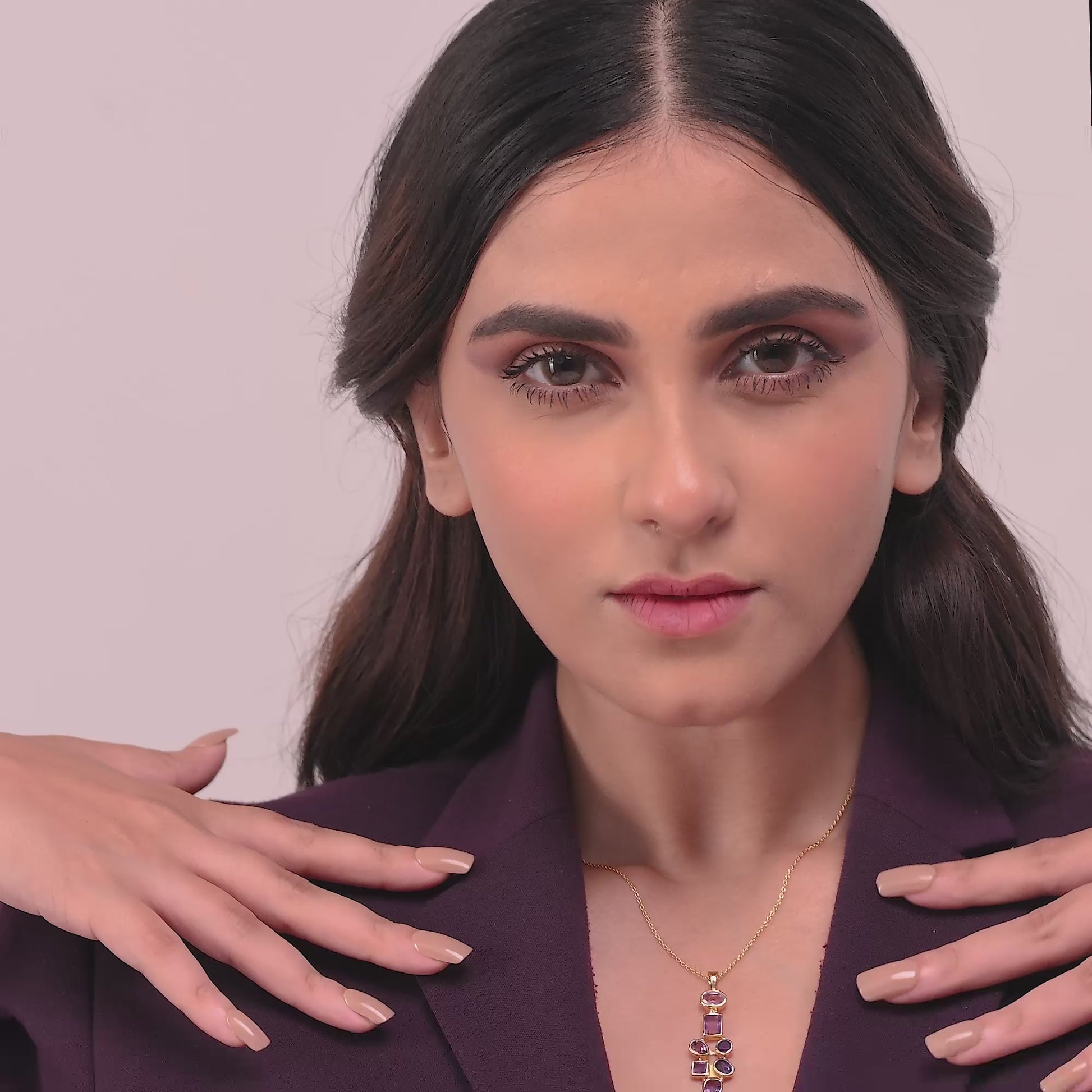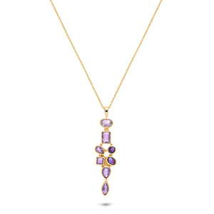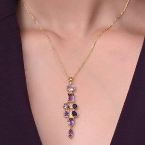 A luxurious drop of elegance, this pendant showcases a stunning arrangement of amethyst gemstones in multiple cuts — oval, pear, and emerald — all set in gold-plated 925 sterling silver.