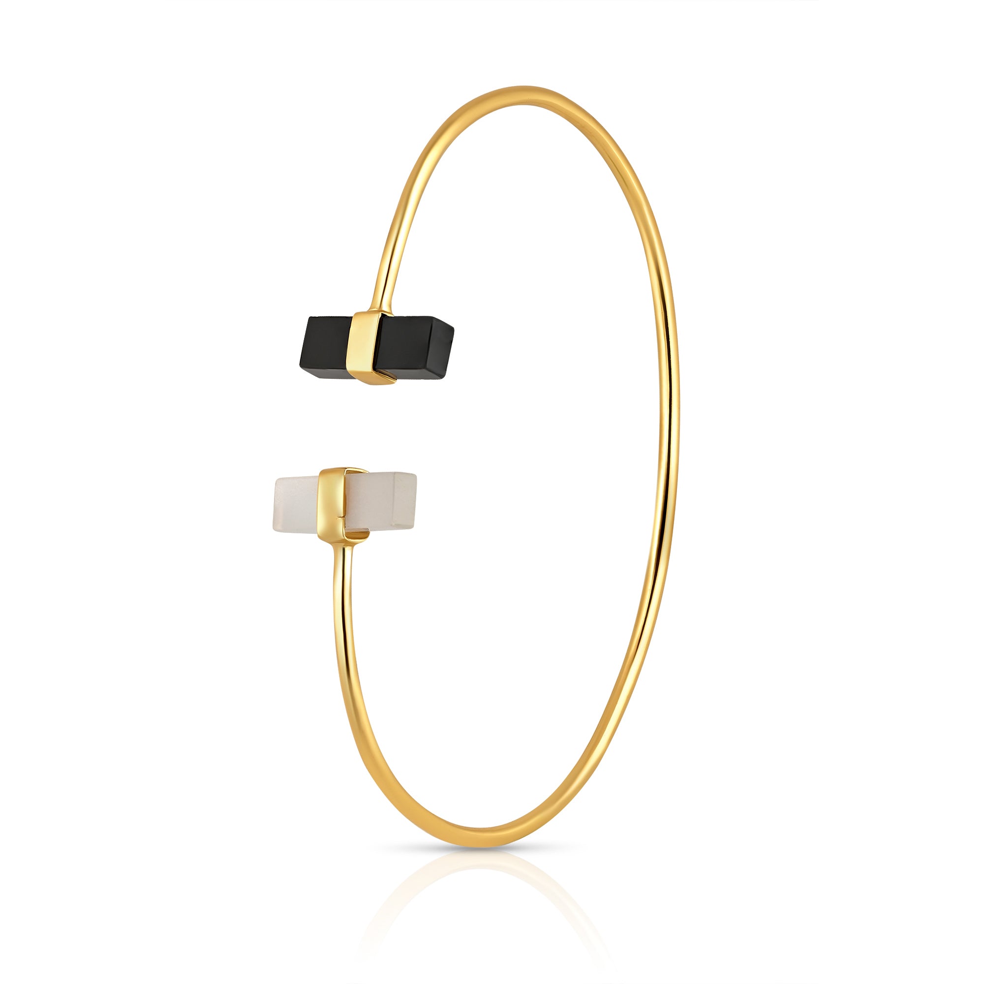 Discover understated luxury with the 'Gilded Muse' cuff. This exquisite 18K gold plated sterling silver bracelet features a delicate yet commanding presence, perfected by its discreet geometric motif and alluring black white moonstone