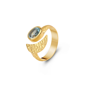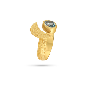 18k gold-plated ring featuring a delicate crescent structure embracing a radiant blue topaz, inspired by the graceful allure of Venus in the night sky.
