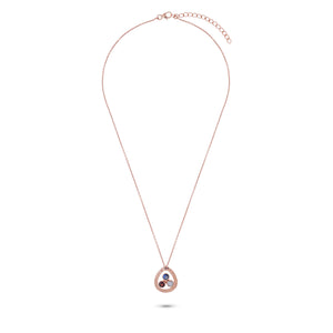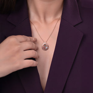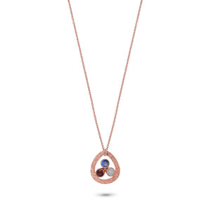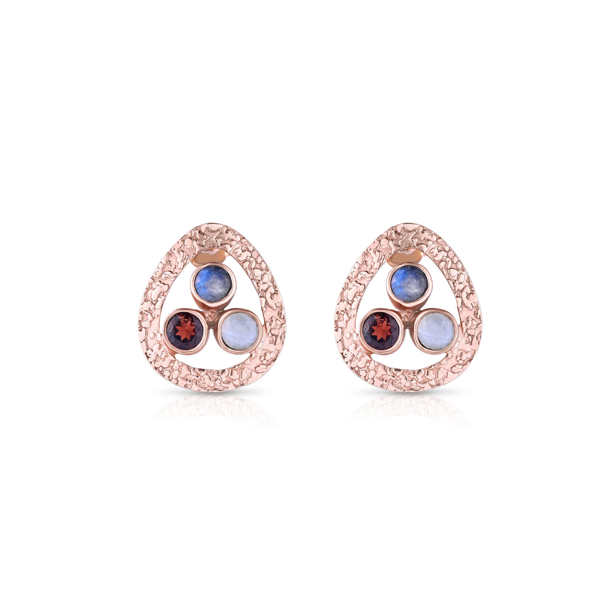 A modern talisman featuring three bezel-set gemstones — moonstone, garnet, and labradorite — resting in a softly hammered 18k rose-plated sterling silver frame.