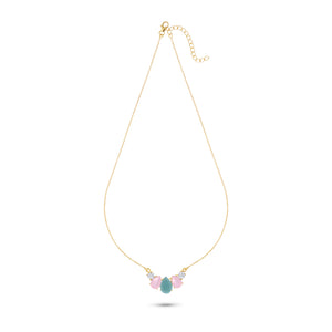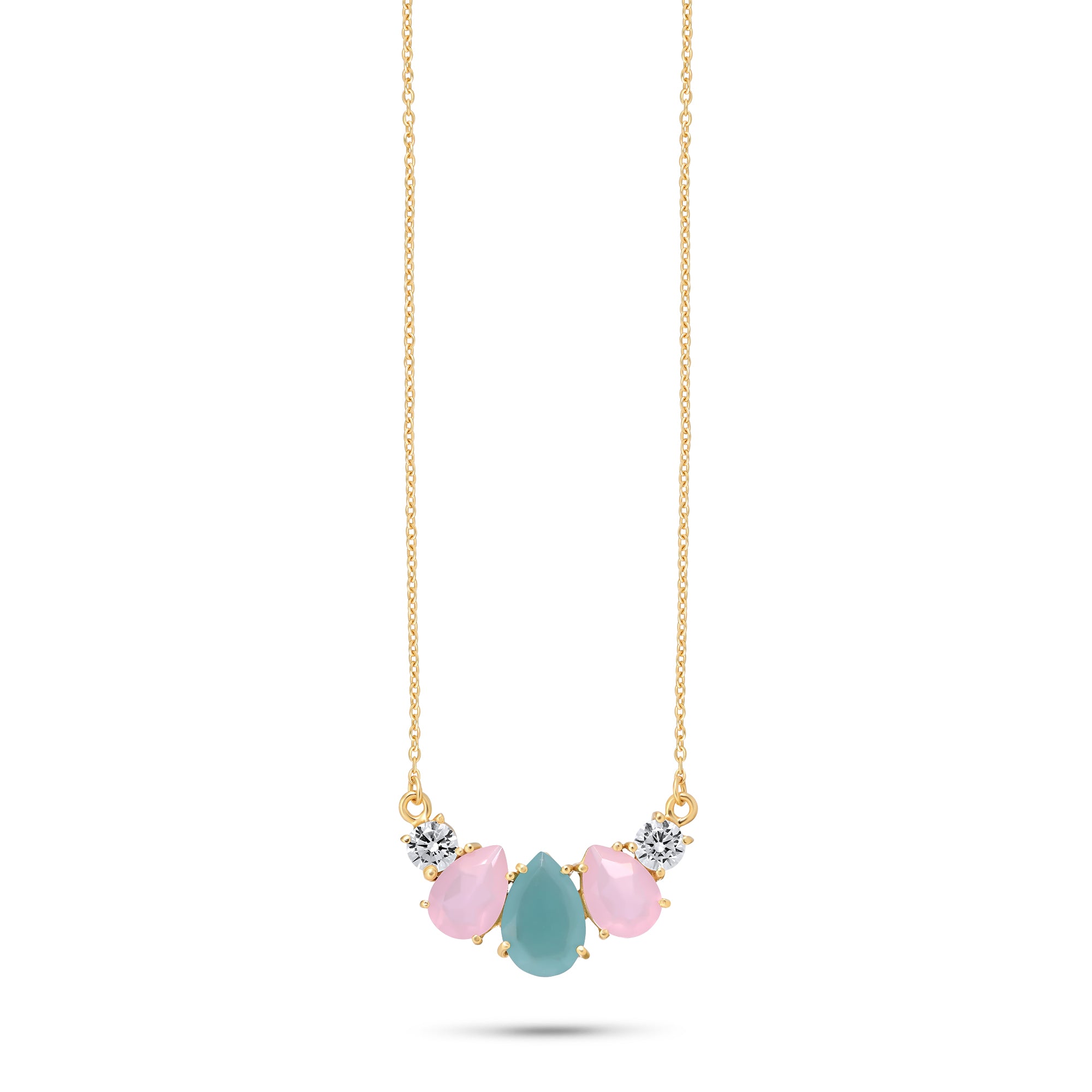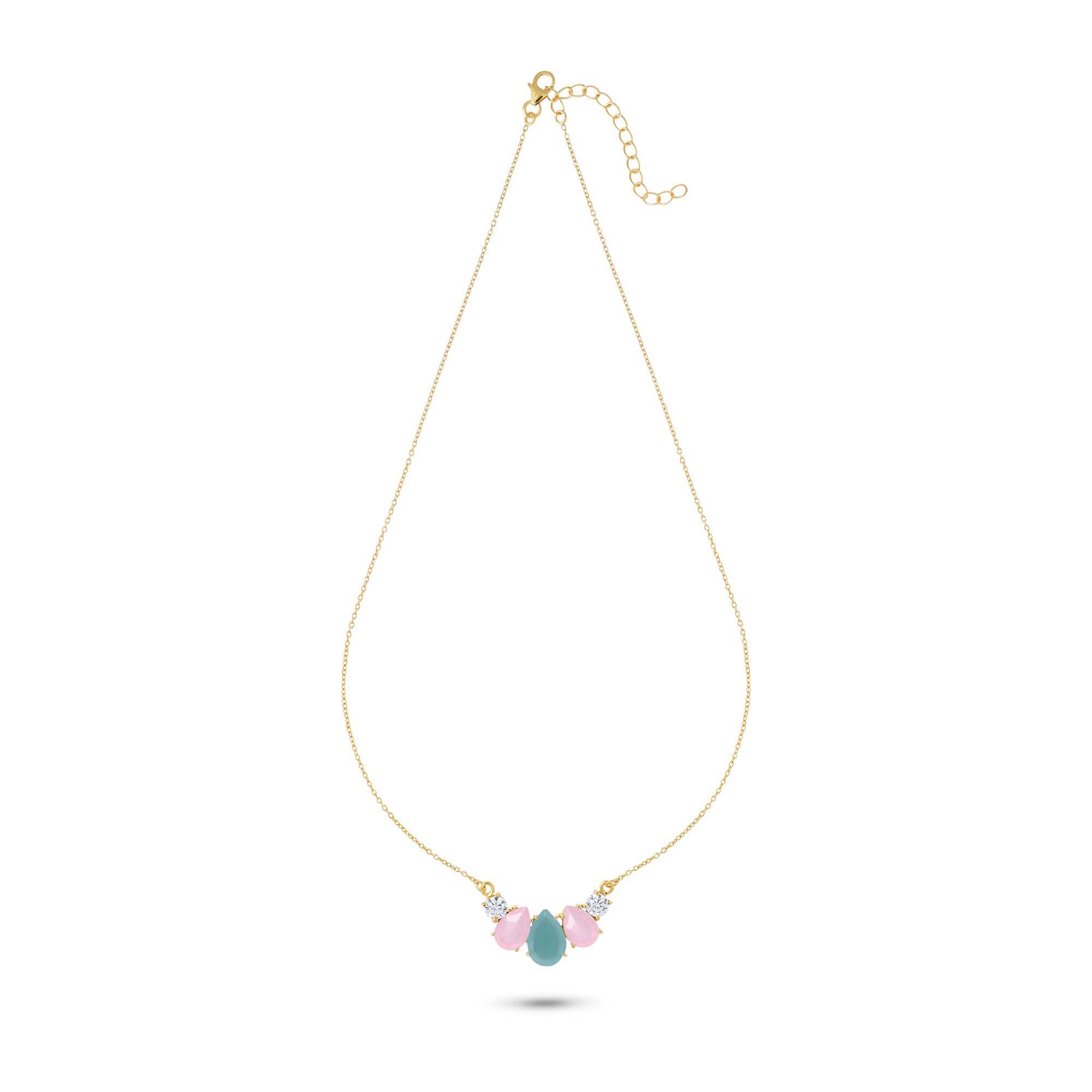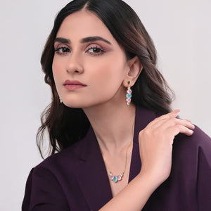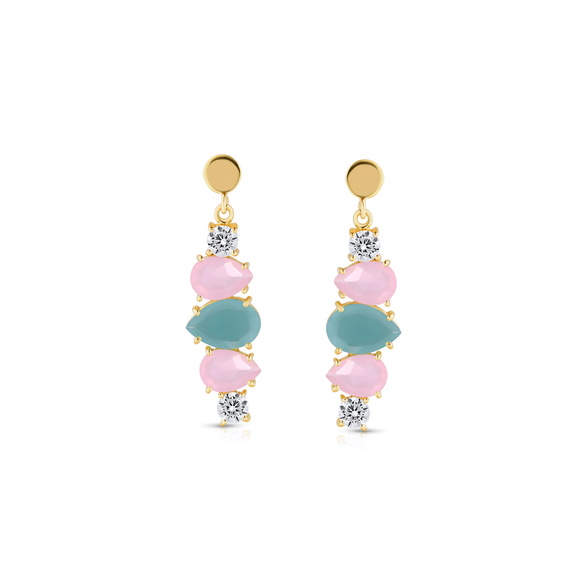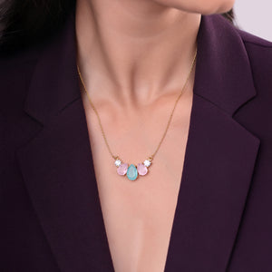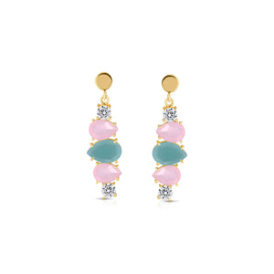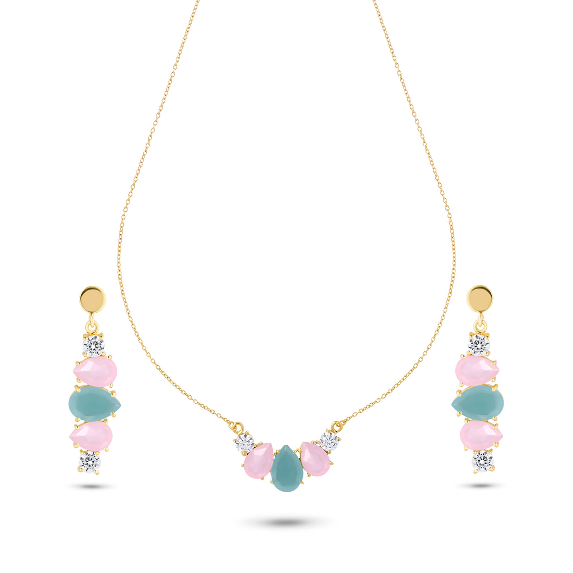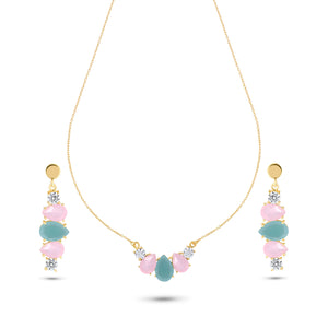 the Set features a soothing aqua chalcedony teardrop at its heart, flanked by soft pink chalcedony drops and twinkling cubic zirconia accents. Set in 18k gold-plated sterling silver, this piece glows with pastel tones and timeless charm — perfect for festive moments or elegant gatherings.
