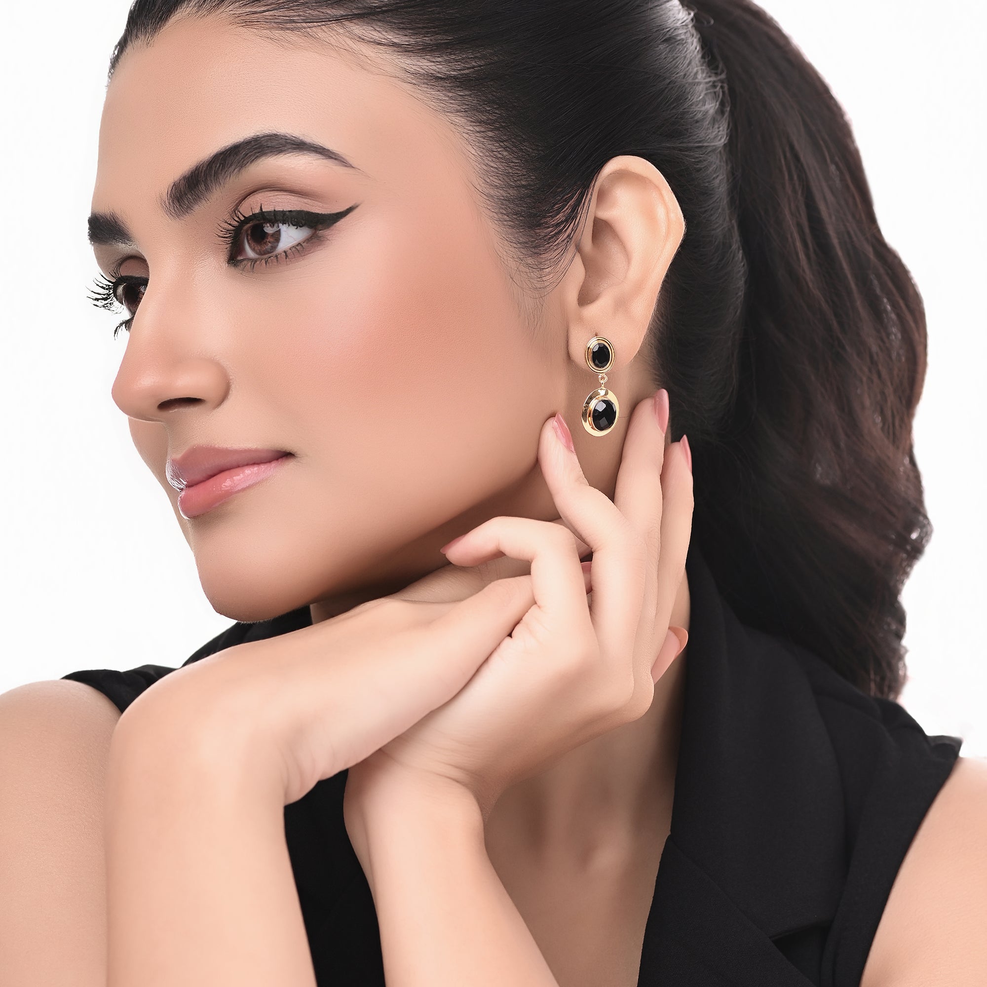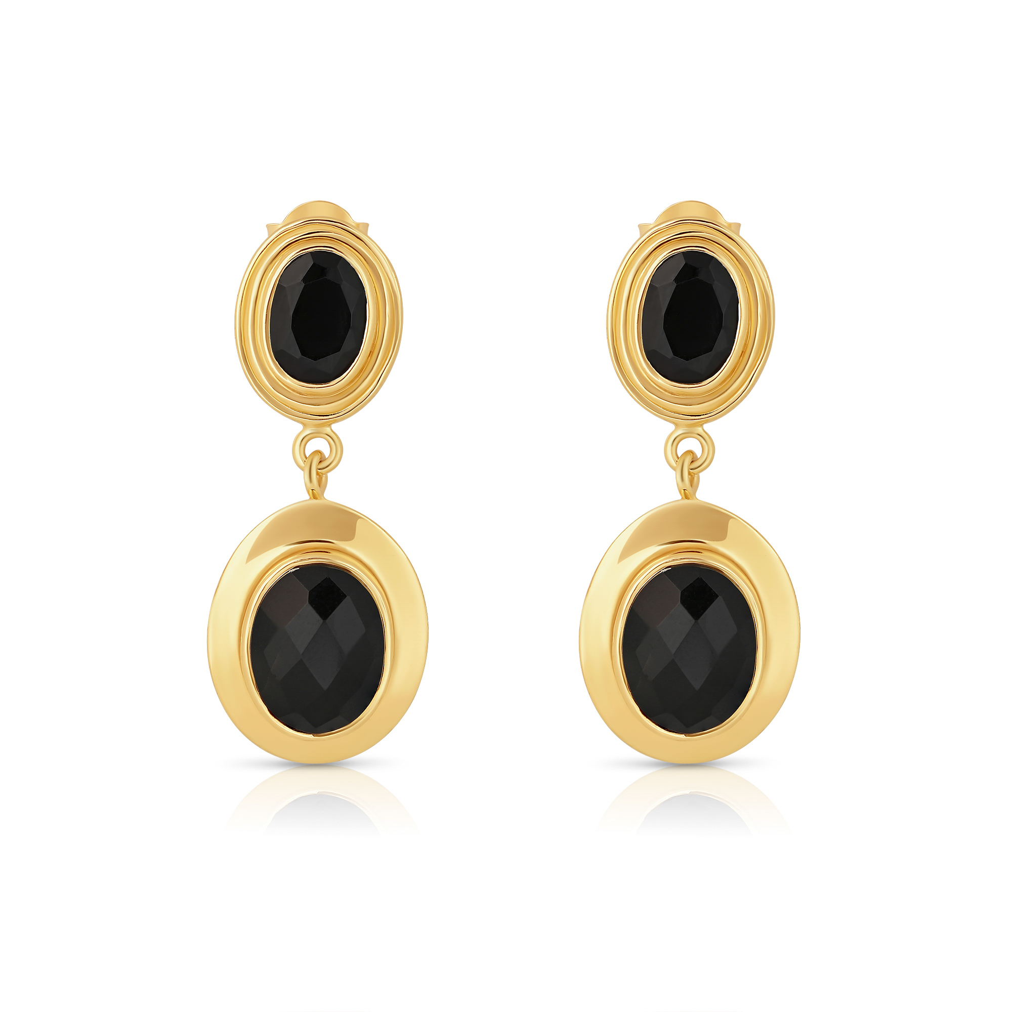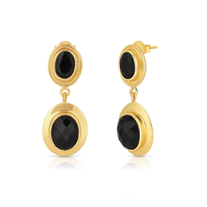 Inspired by the celestial beauty of nightfall, these dual black stone earrings radiate moody glamour in 18k gold plating.