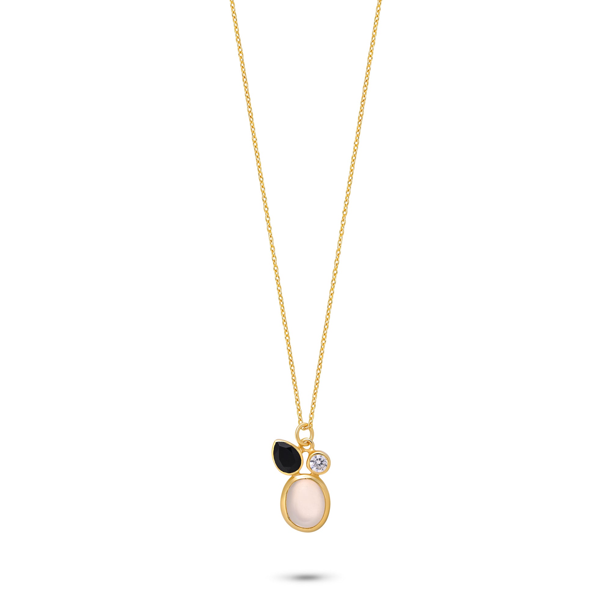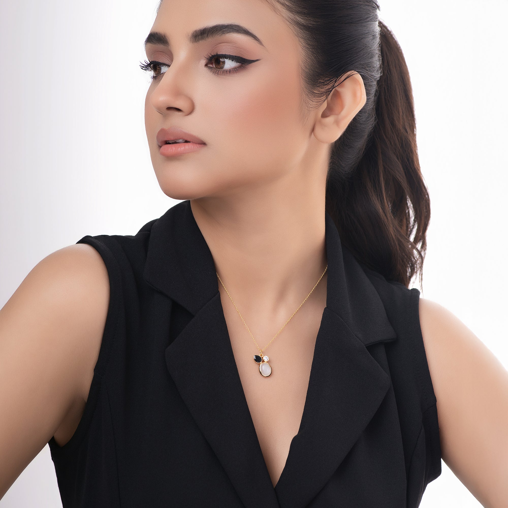 Crafted in 925 sterling silver with luxurious gold plating, this minimalist pendant features a stunning trio of stones: a soft moonstone, a sleek black onyx, and a sparkling cubic zirconia.