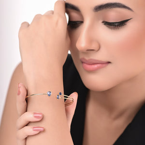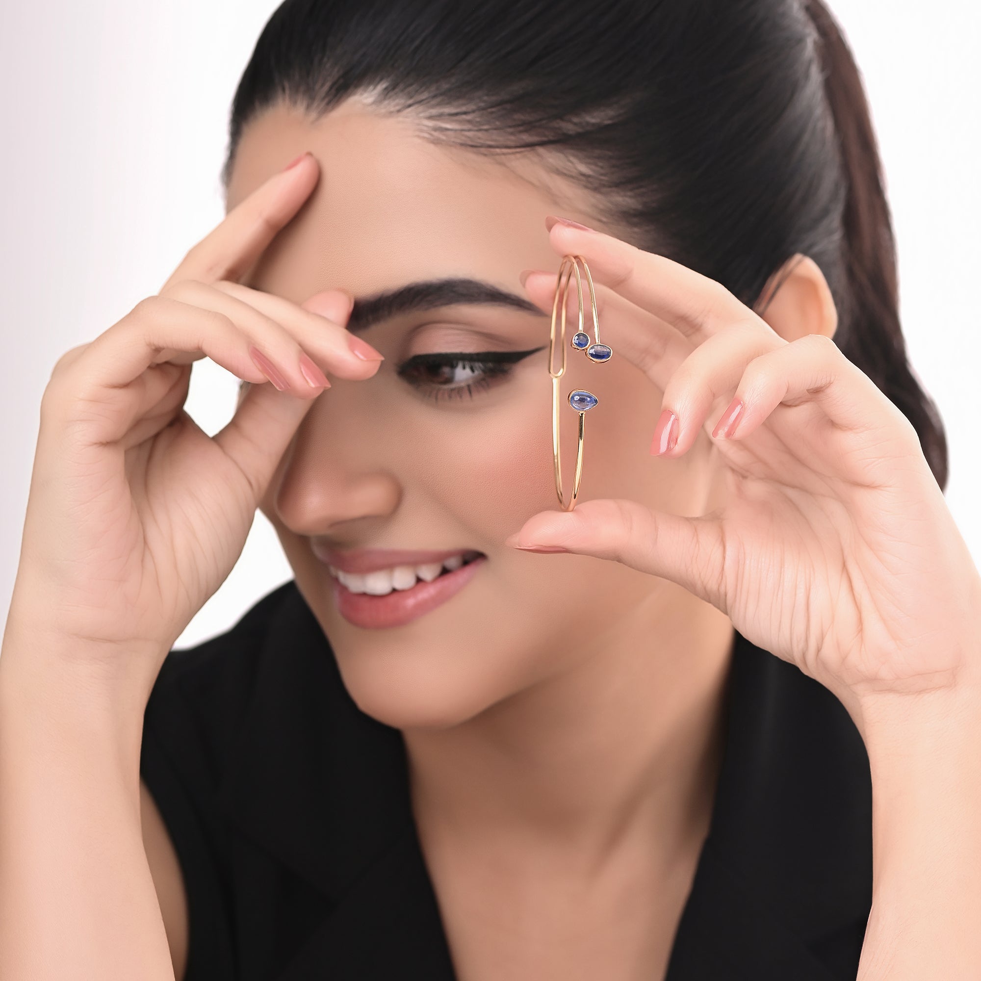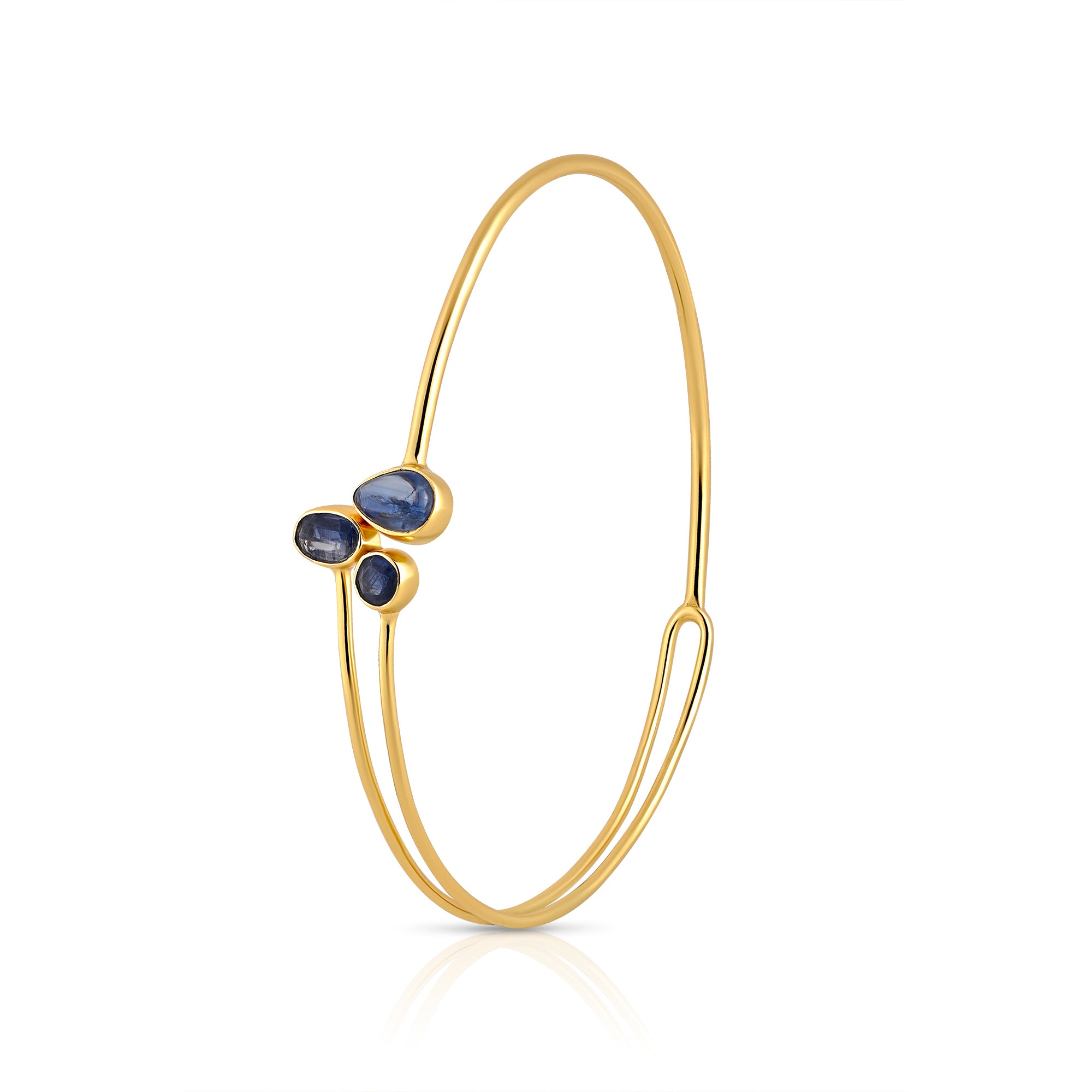 Journey into sophisticated depths with the 'Abyss Glimmer' bangle. Expertly crafted from 18K gold plated sterling silver, this piece features three luminous kyanite stones, mirroring the mysterious, radiant blues found in the ocean's profound heart.