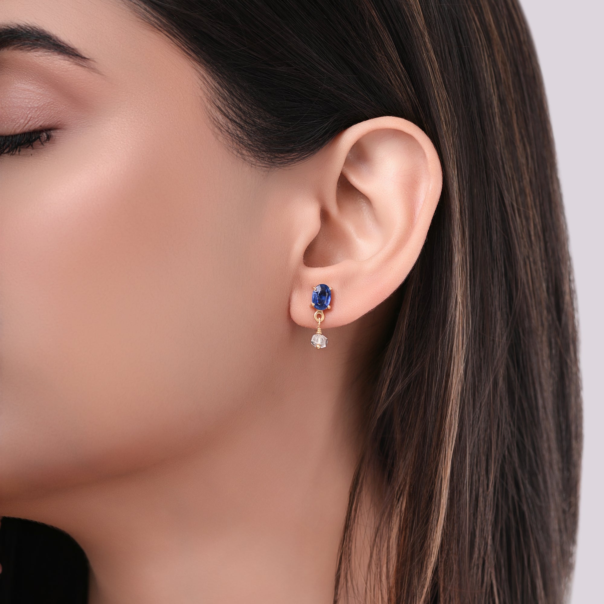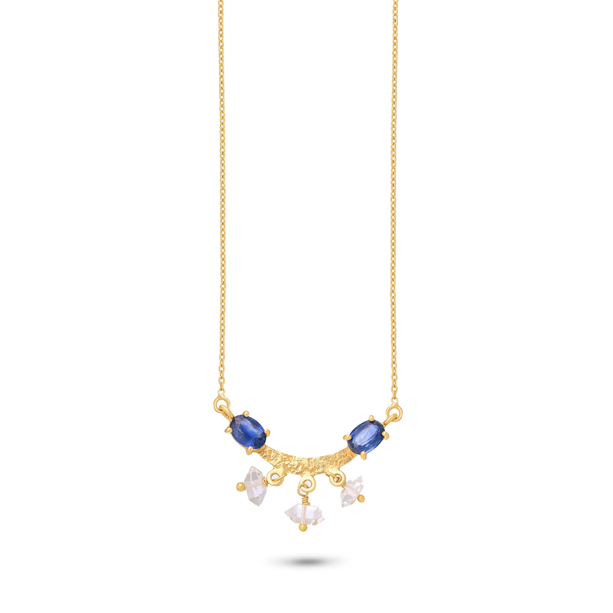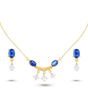 A refined dance of deep blue kyanite and radiant Herkimer quartz, this necklace and earrings setcaptures the beauty of twilight skies. Suspended on a delicate gold-plated chain, it balances grounded elegance with celestial sparkle — a piece that feels both calming and luminous.