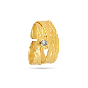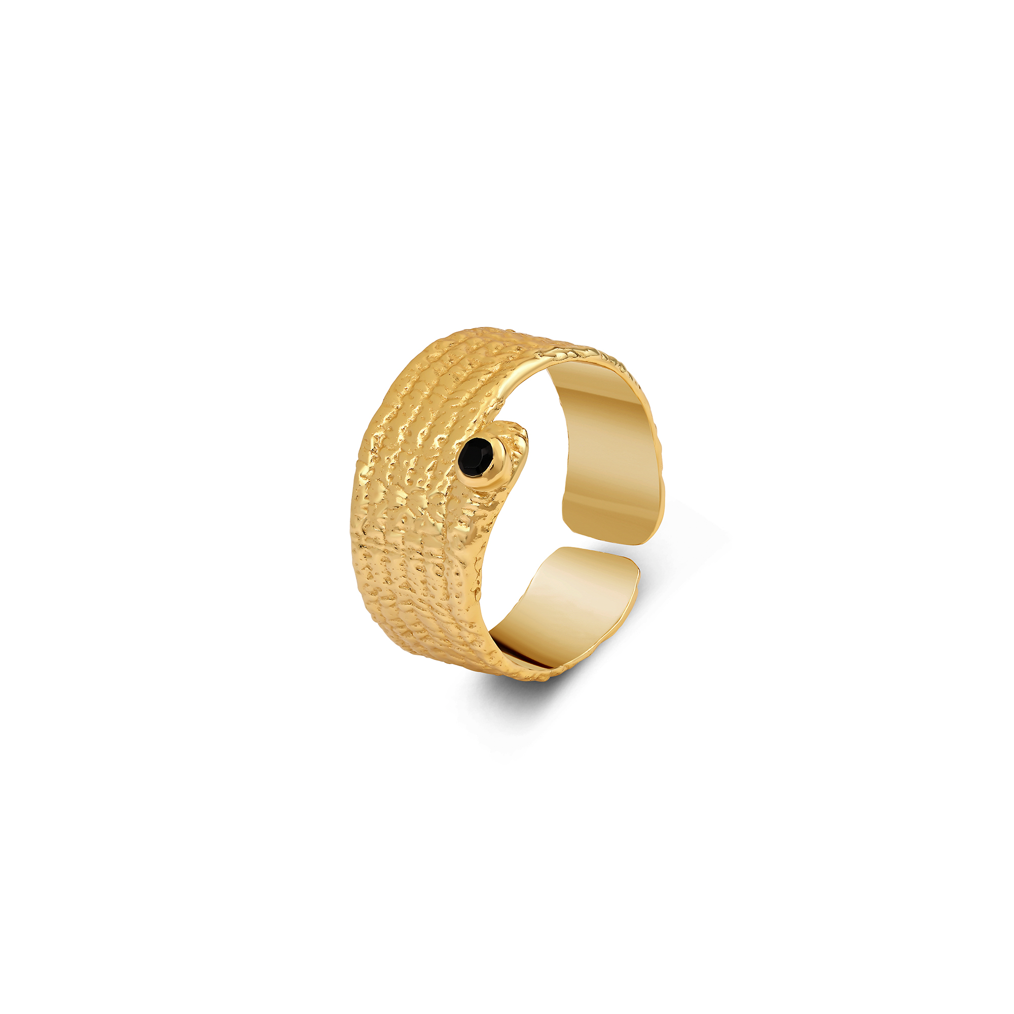 An 18k gold-plated ring showcasing a dazzling blue topaz, evoking the crisp, shimmering hues of a frozen ocean