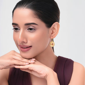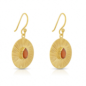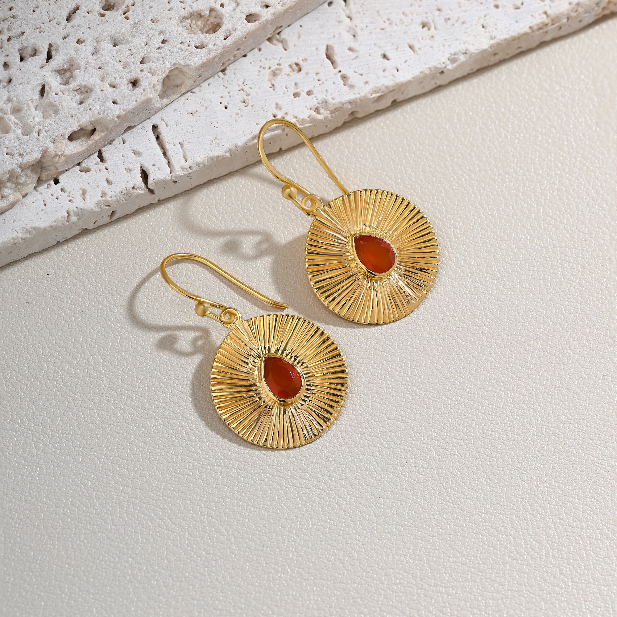 18k gold-plated circular drops with textured sunray details, featuring a leaf-shaped carnelian stone at the center — a warm and radiant blend of nature-inspired elegance.