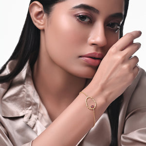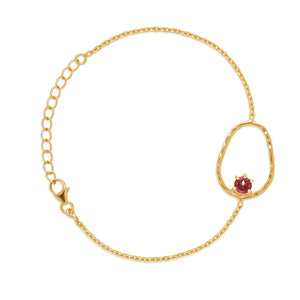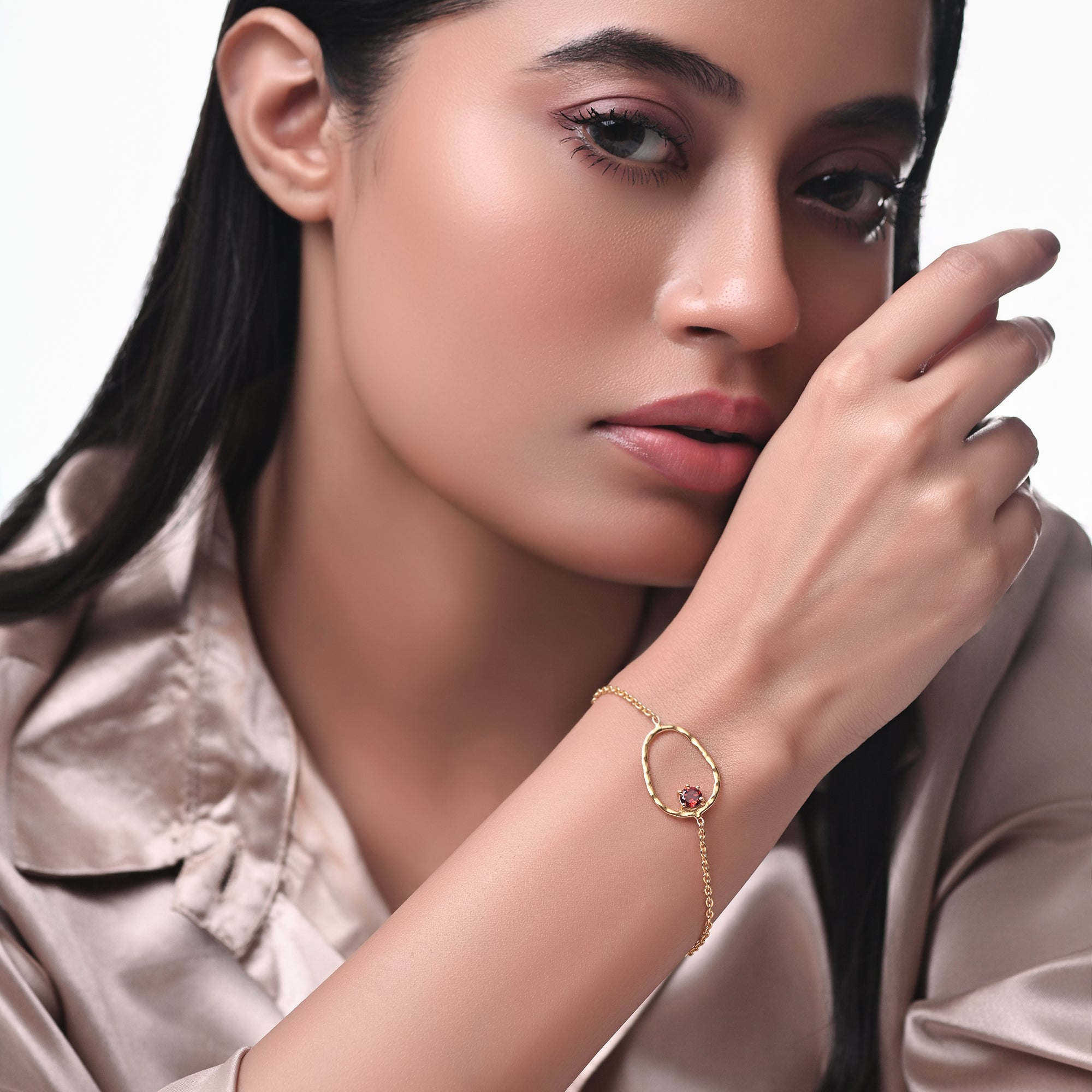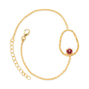 Adorn your wrist with timeless elegance. This delicate bracelet features an 18k gold-plated sterling silver chain suspending a beautifully textured oval pendant, accented with a vibrant, natural garnet stone.