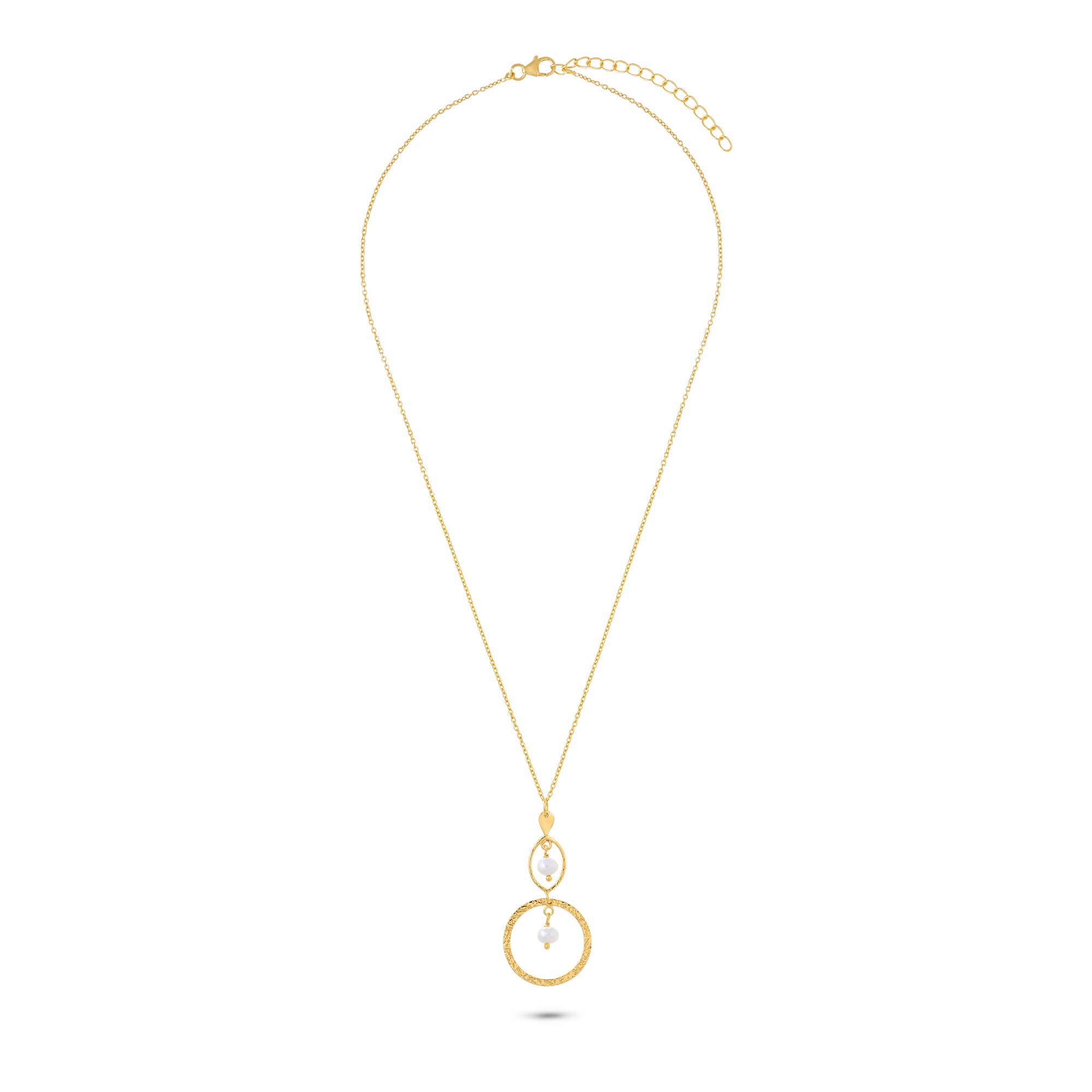 Elegant and ethereal, it features a delicate pearl suspended inside a gold-plated circle, symbolizing grace in motion. Crafted from 925 sterling silver with 18K gold plating