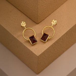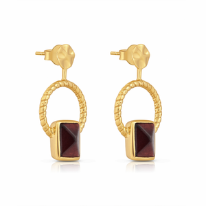 Crafted in luminous 18K sterling silver, these hoops showcase a radiant garnet centerpiece surrounded by a delicately textured halo