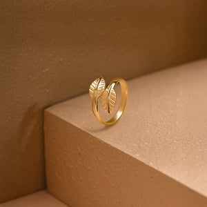 18k gold-plated ring featuring two graceful leaf motifs intertwined, embodying nature’s elegance and balance in a minimalist design.