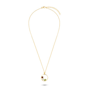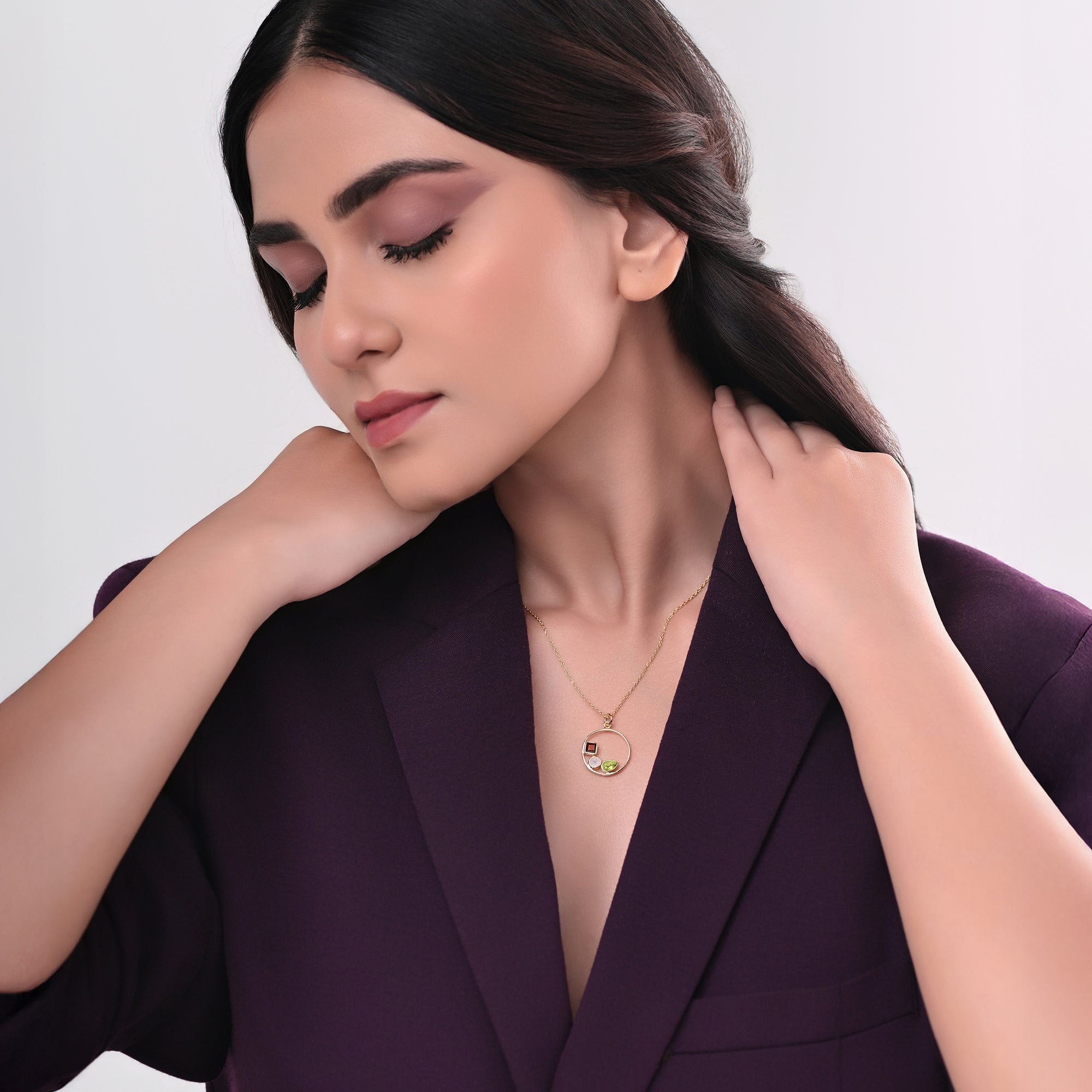 Crafted in sterling silver with an 18k gold plating, this pendant showcases a trio of radiant gemstones—garnet, peridot, and moonstone—arranged in a circle of elegance, evoking the beauty of a divine garden in bloom.