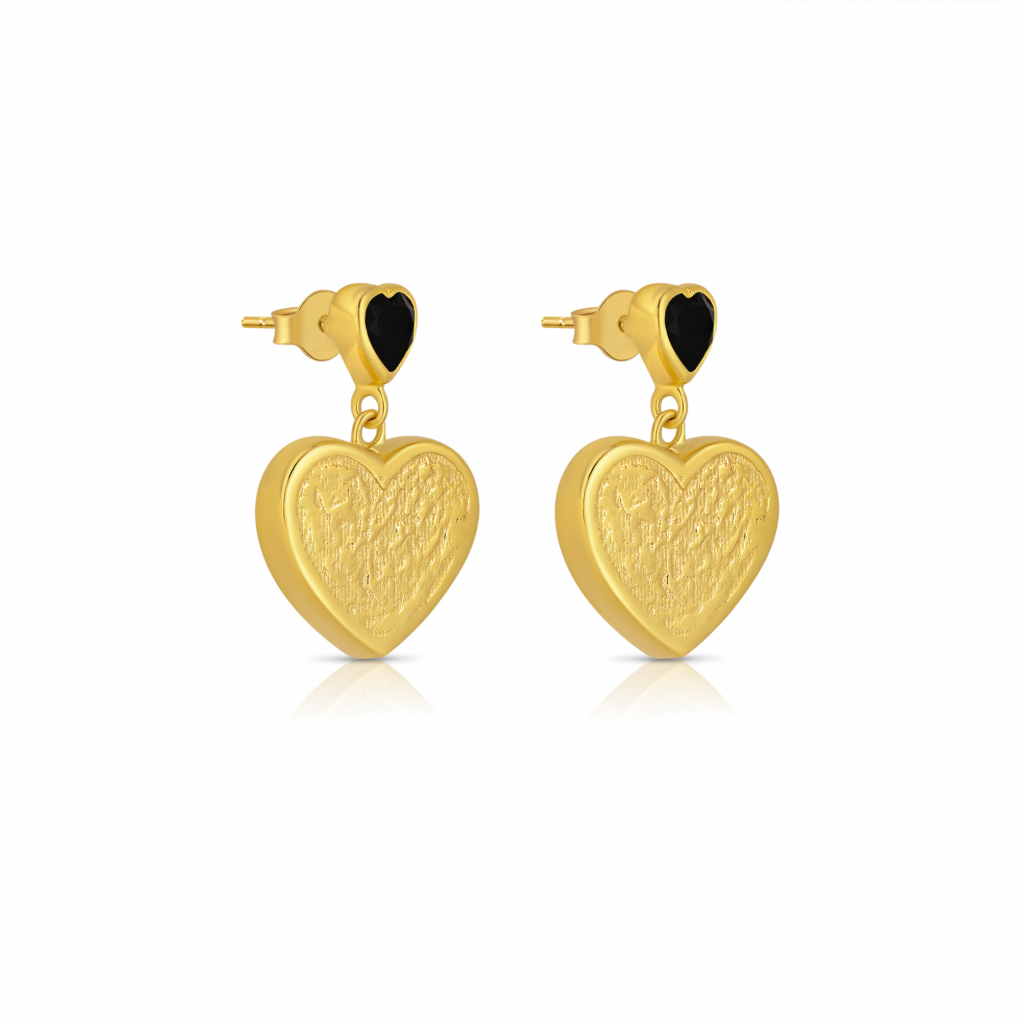 Elegant earrings featuring a black onyx stud atop a sculpted gold heart, blending bold contrast with timeless romance in every drop.