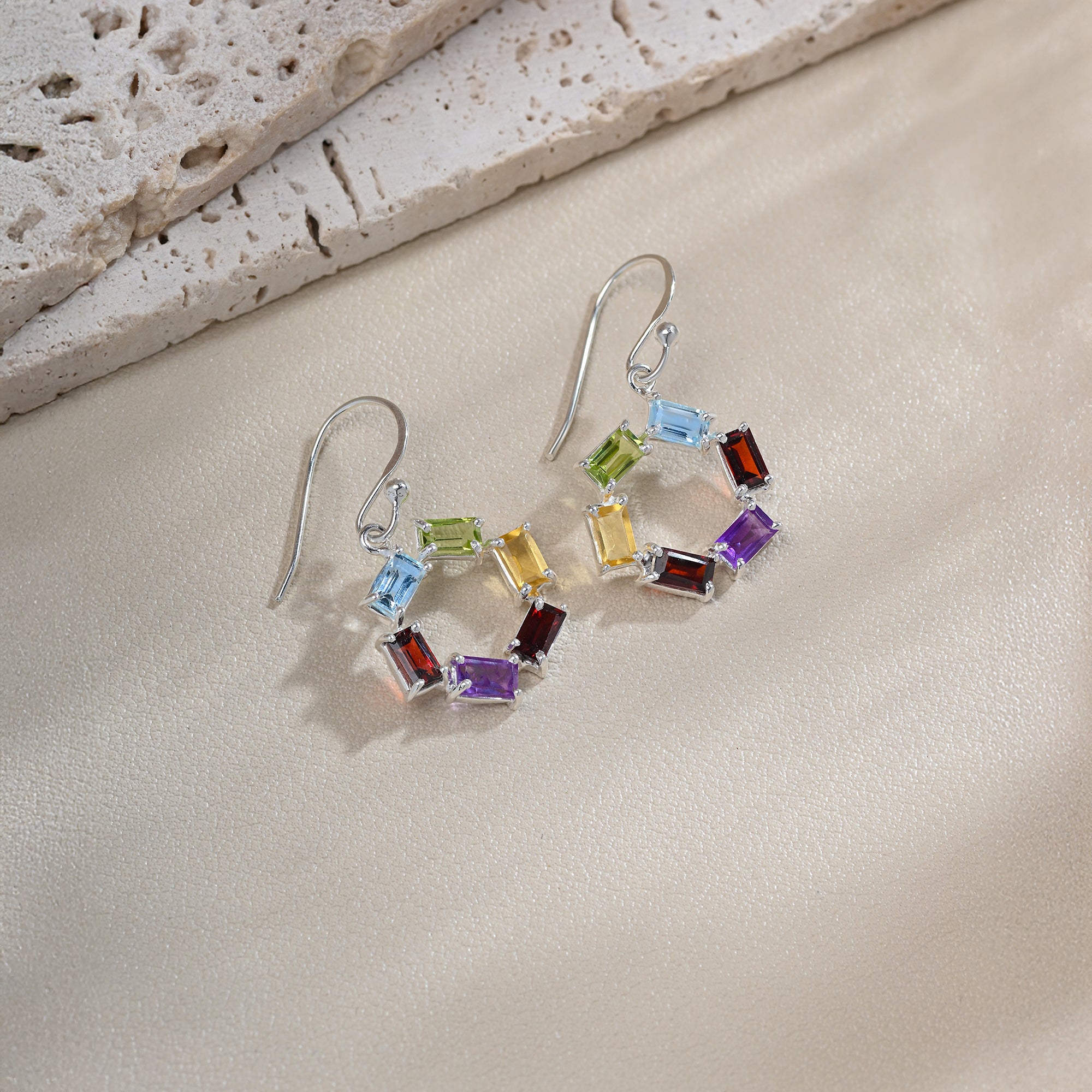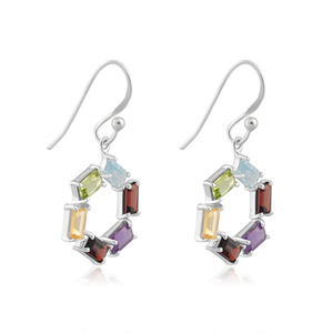 Circular silver hoops adorned with a vibrant array of multicolored stones, capturing the dynamic beauty of a kaleidoscope