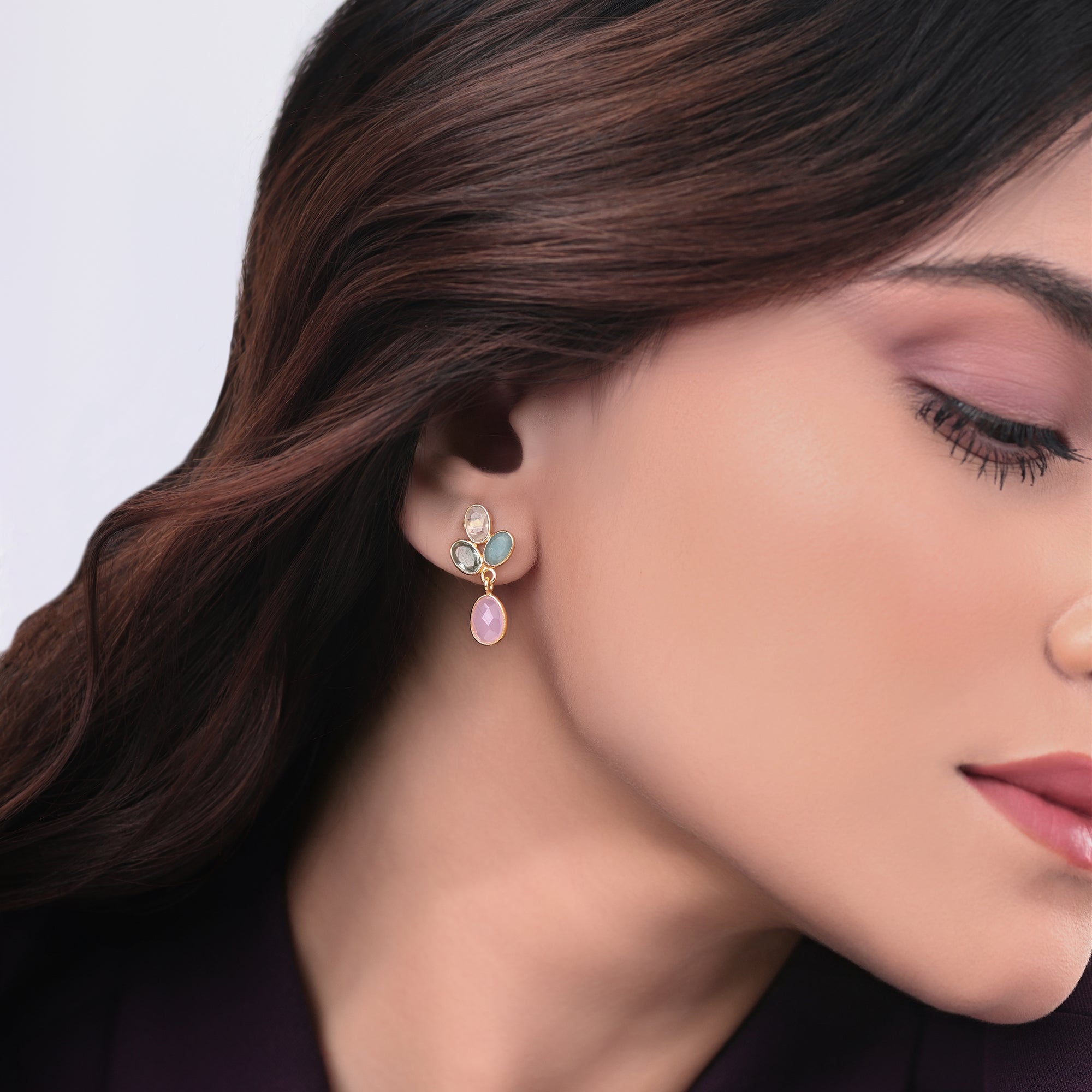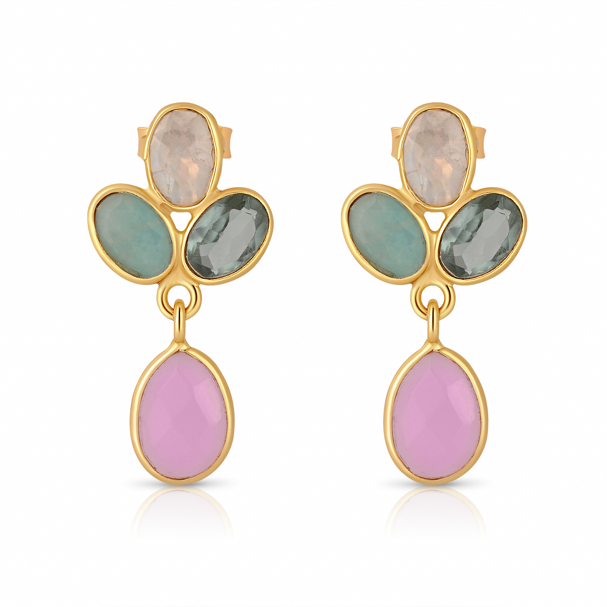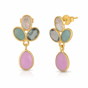 925 sterling silver, gold-plated earrings featuring rainbow moonstone, rose chalcedony, amazonite, and green amethyst — a soft and feminine cluster of semi-precious elegance.