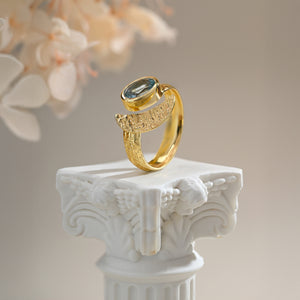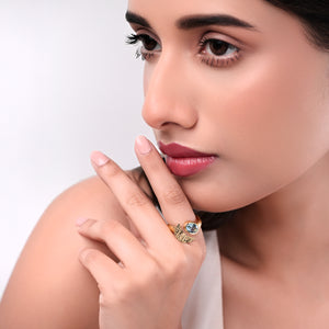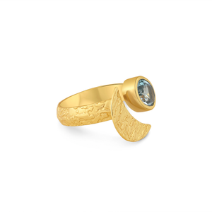 18k gold-plated ring featuring a delicate crescent structure embracing a radiant blue topaz, inspired by the graceful allure of Venus in the night sky.