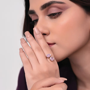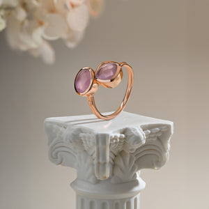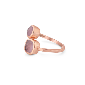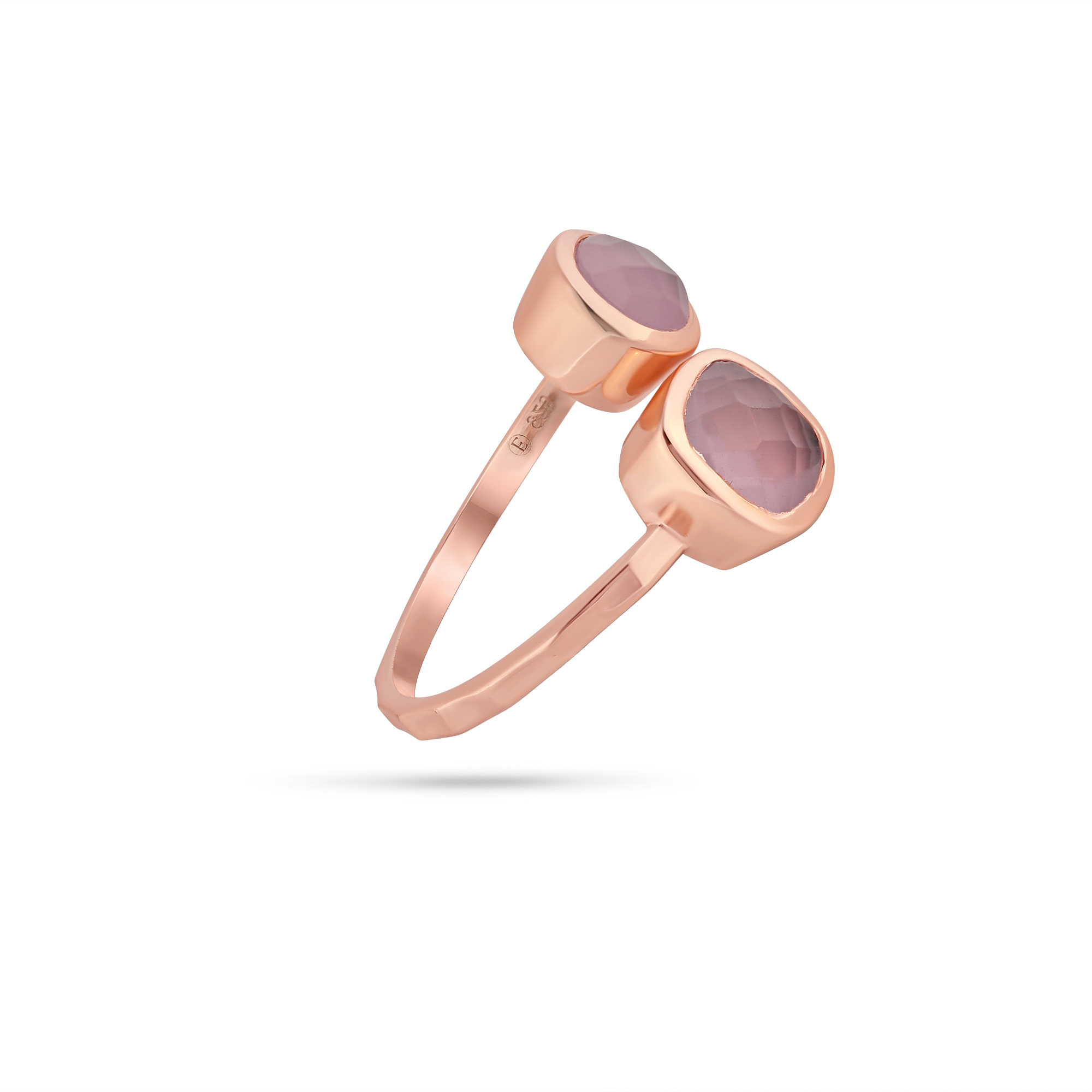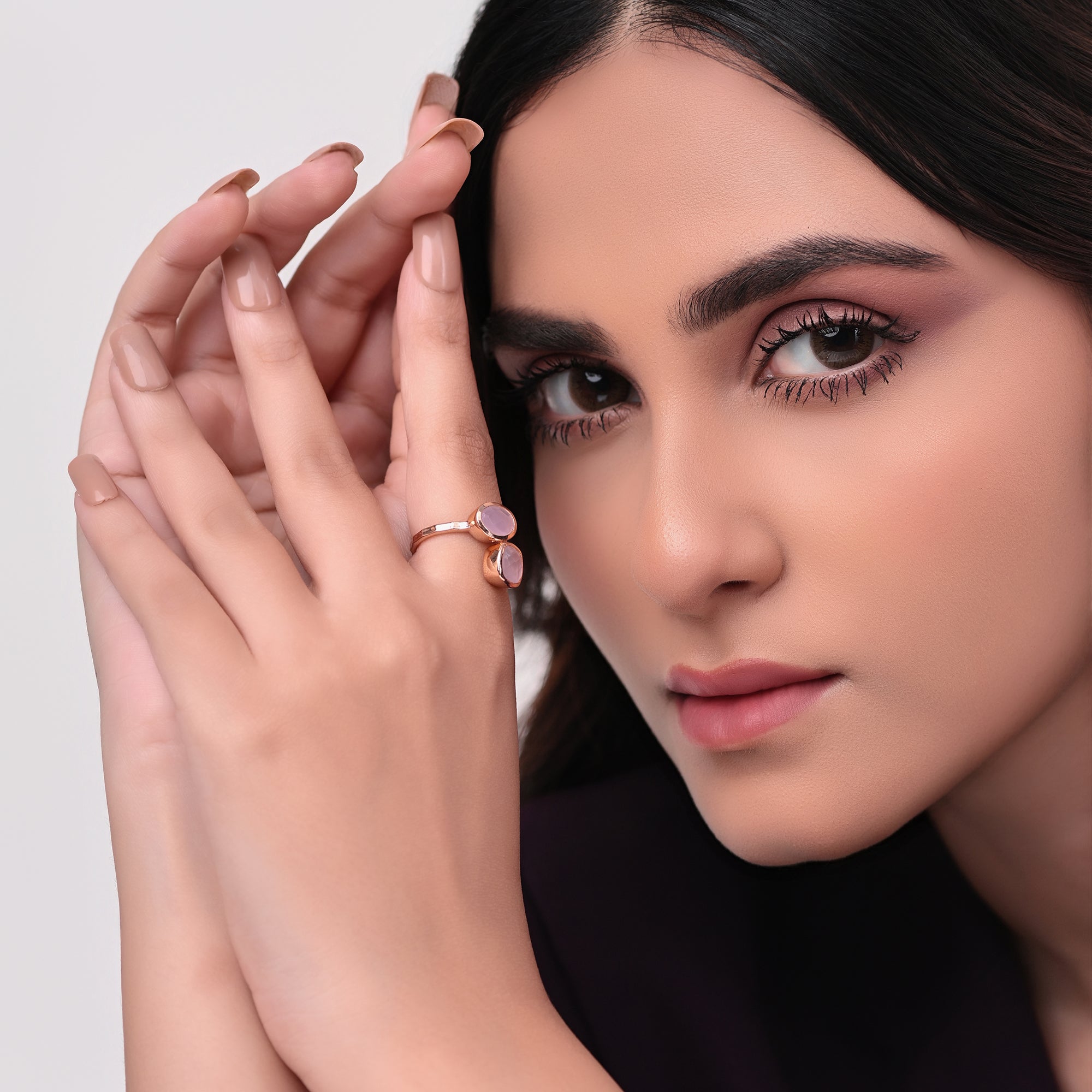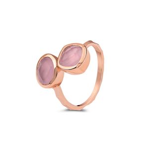 A delicate beauty crafted in rose gold-plated sterling silver, this ring features soft, glowing rose chalcedony stones. Feminine, fresh, and perfect for everyday elegance.