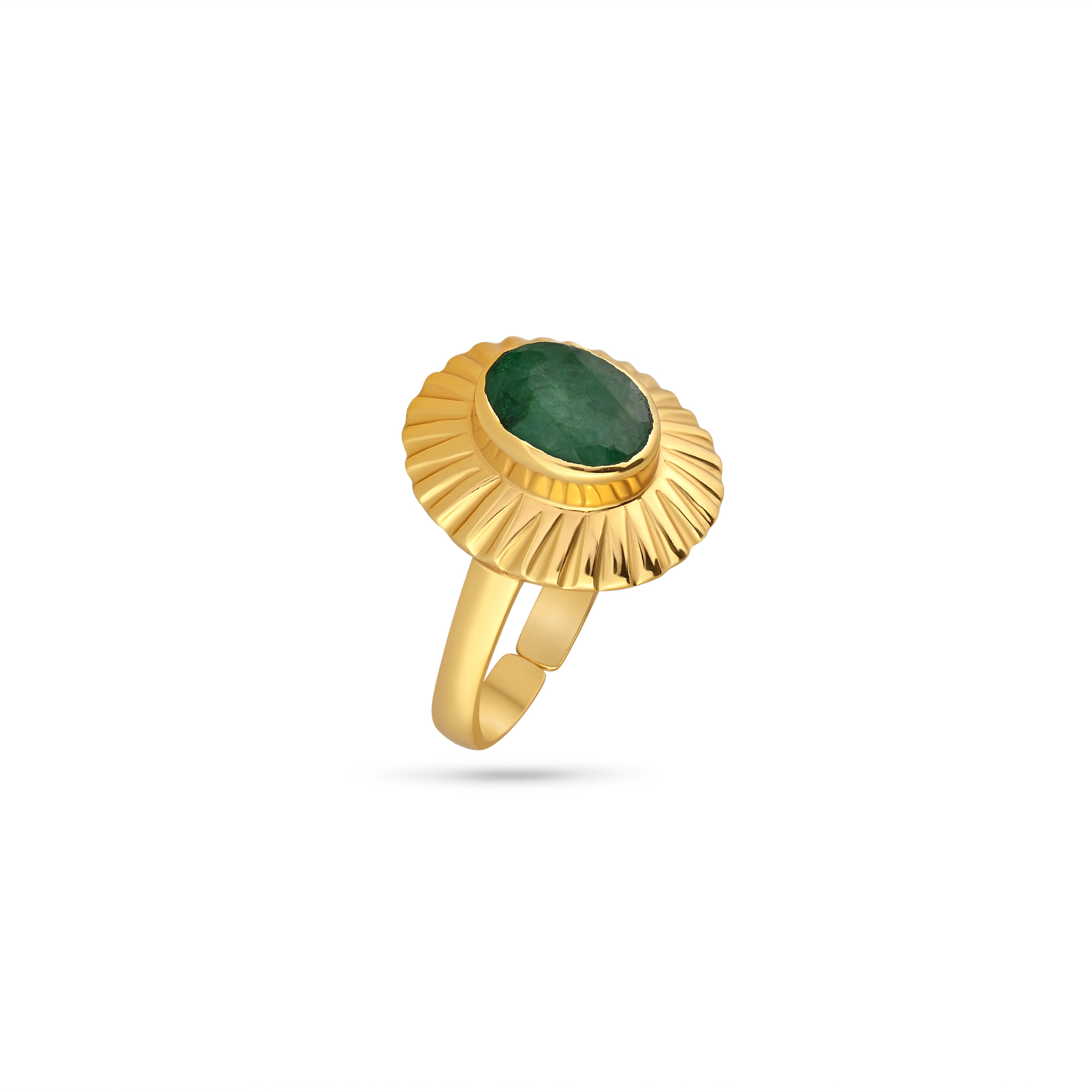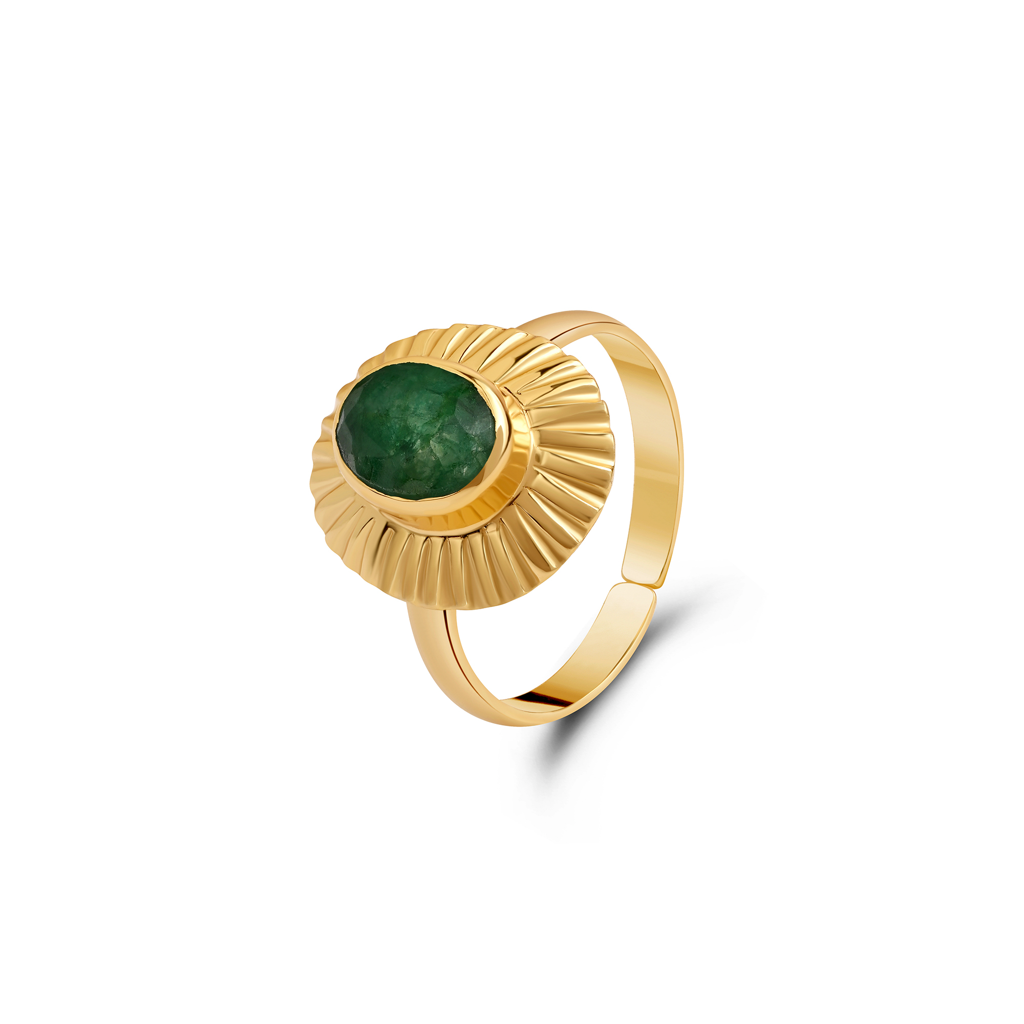 18k gold-plated ring showcasing a vibrant emerald-inspired gemstone, blending classic sophistication with contemporary elegance.