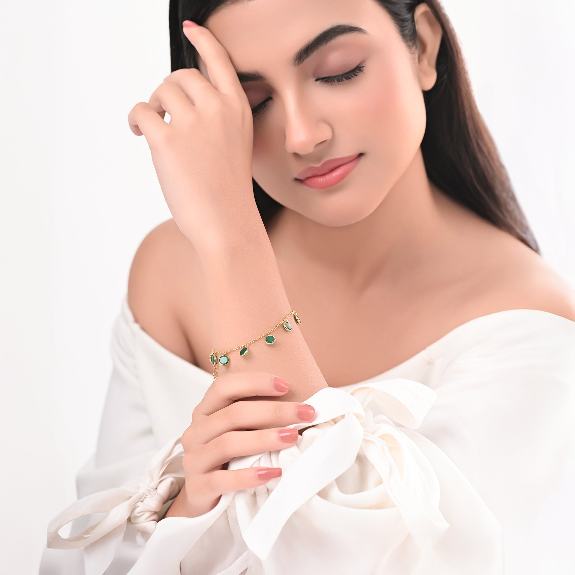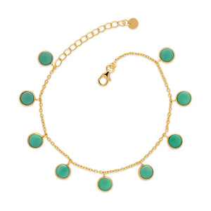 This captivating bracelet features a series of smooth, rich green onyx discs, elegantly bezel-set and linked together by an 18k gold-plated sterling silver chain. A perfect blend of natural beauty and golden radiance.