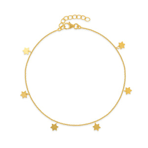 Radiating quiet charm, the Estelle Anklet glimmers with miniature star charms in 18k gold plated sterling silver. A graceful ode to starlit nights and timeless elegance.