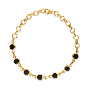 This striking bracelet features a series of captivating black onyx cabochons or facets, elegantly linked by an 18k gold-plated sterling silver chain. It's a sophisticated piece that adds a touch of bold contrast to any ensemble.