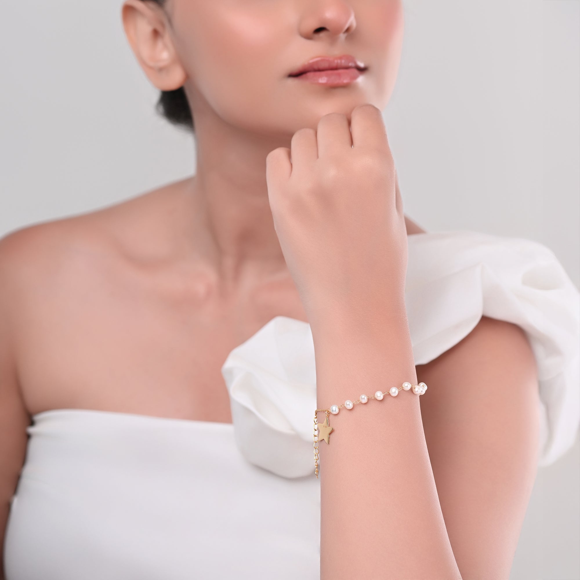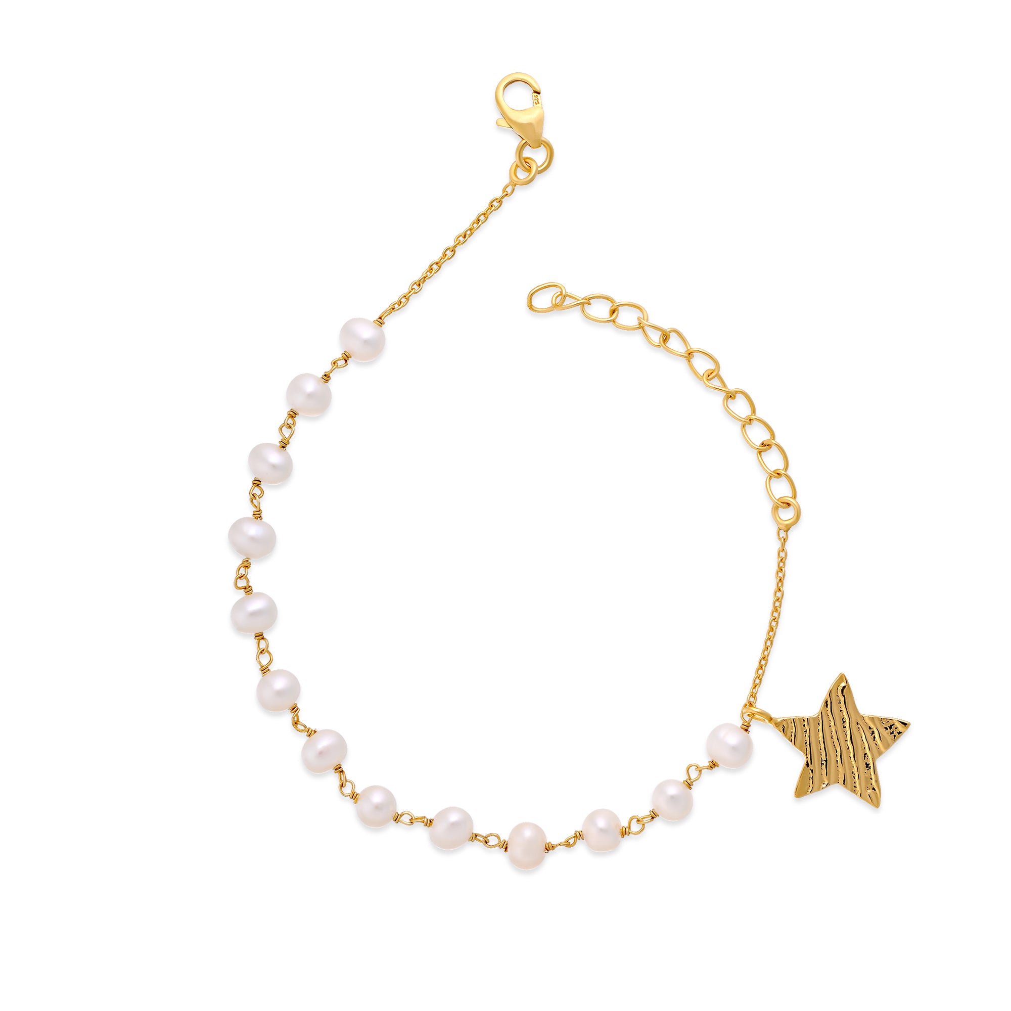 Discover understated glamour with this chic bracelet. It showcases a playful cluster of small, creamy pearls accented by a unique textured gold-tone charm in 18k sterling silverThe delicate chain and secure clasp ensure a comfortable fit.