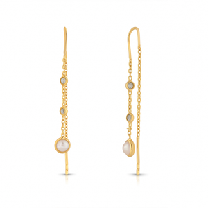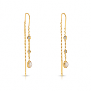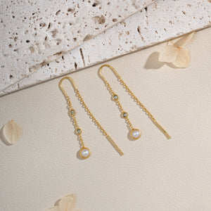 Elegant threaded earrings featuring luminous pearls paired with sparkling blue topaz, set in 18K gold-plated sterling silver for a timeless, sophisticated look.