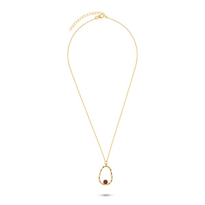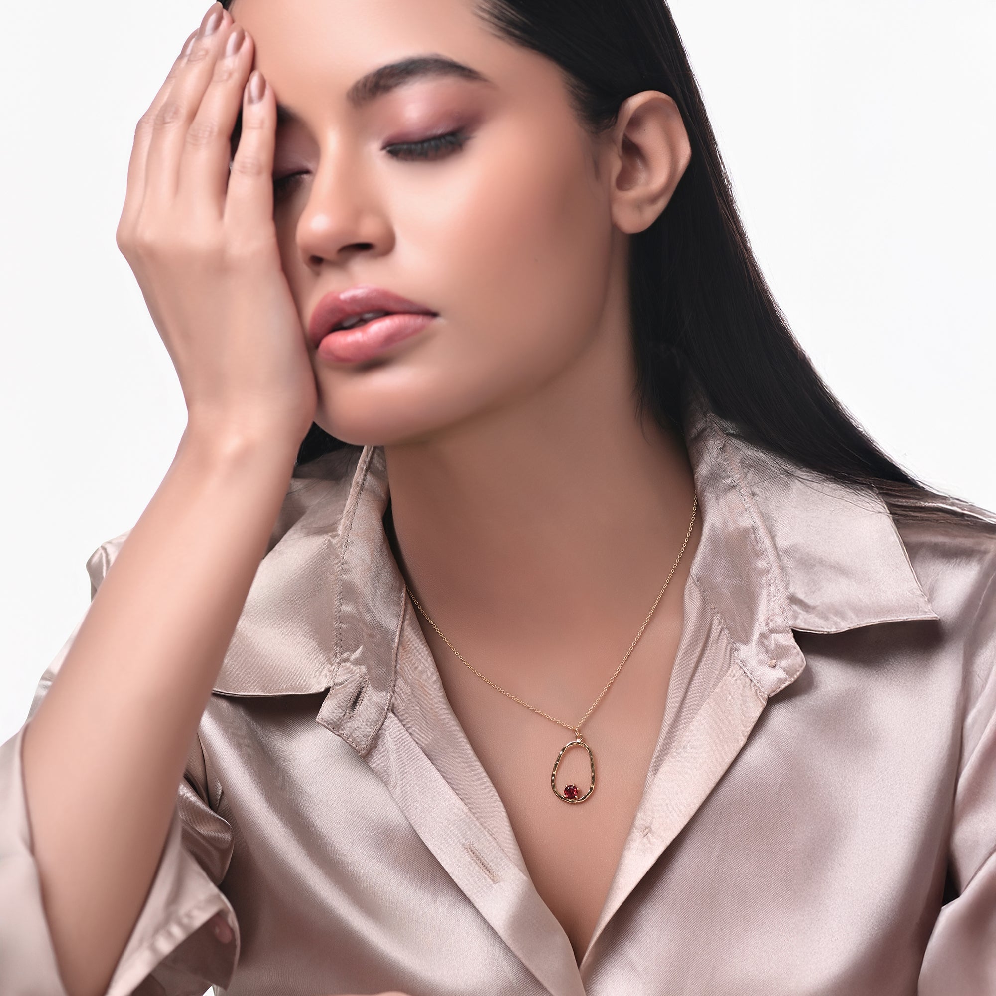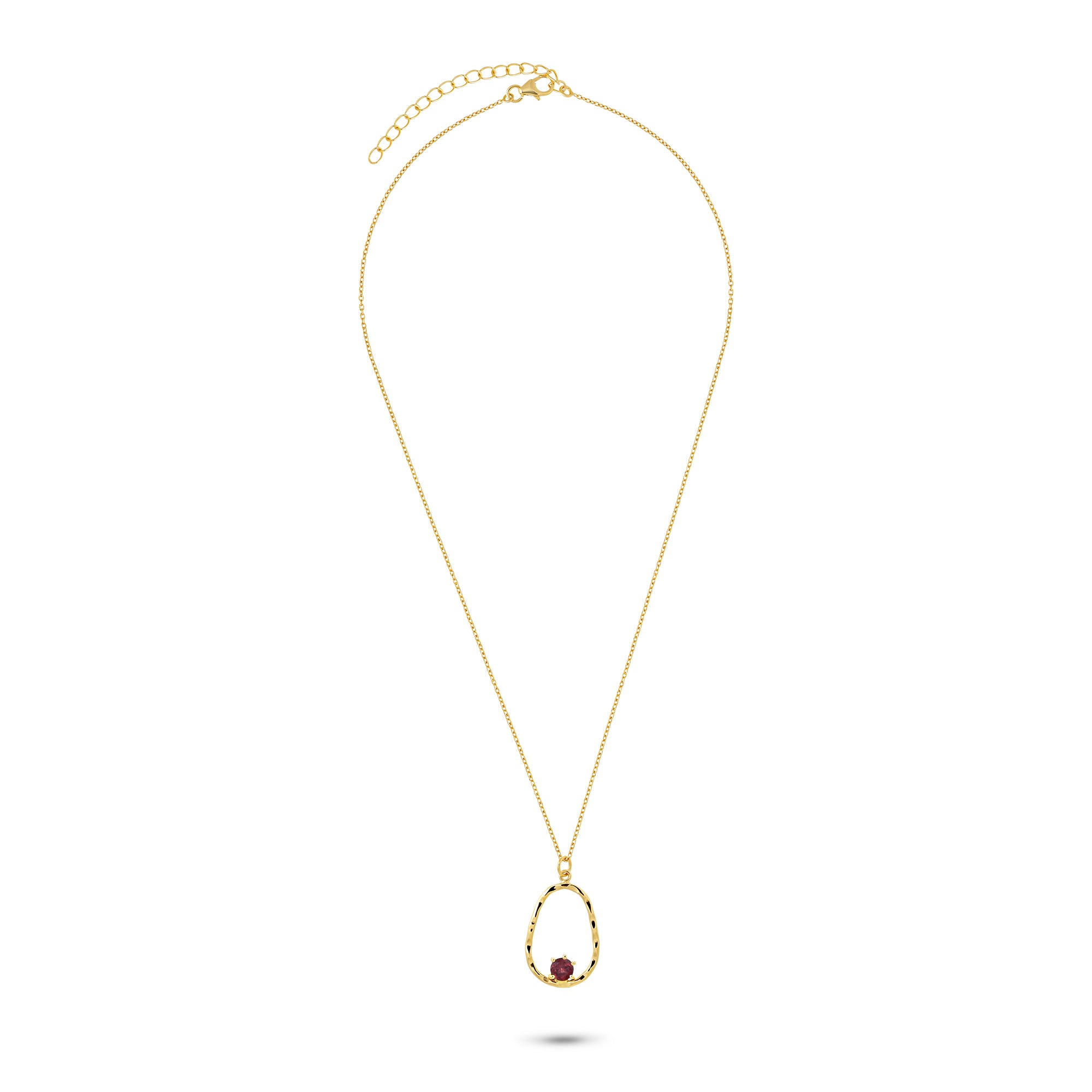 This pendant frames a deep garnet at its heart within a delicate pearl-shaped gold wire. Handcrafted in 925 sterling silver with 18K gold plating
