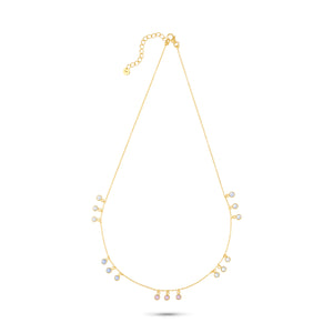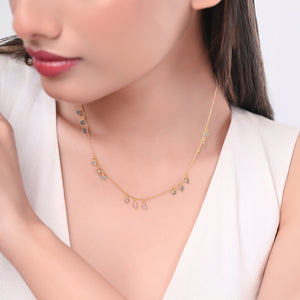 A graceful tribute to the sea, Sea Breeze Blush features gentle aqua and rose chalcedony beads strung along a fine chain of 925 sterling silver with 18K gold plating.