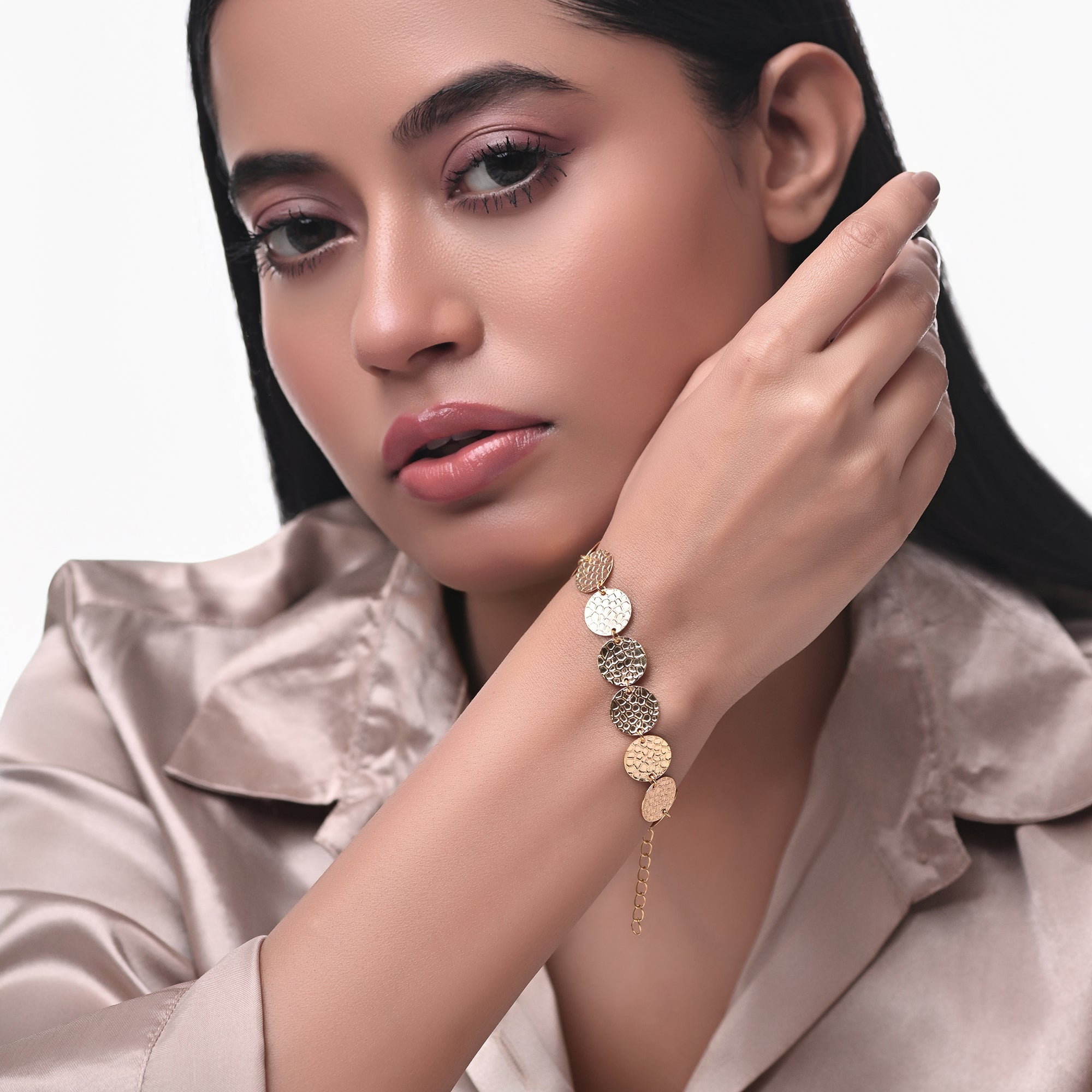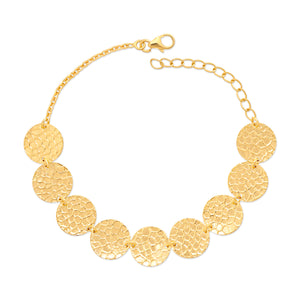 This striking bracelet in 18k gold plated sterling silver features multiple interconnected gold-tone discs with a captivating textured, scale-like finish, creating a bold yet elegant look.