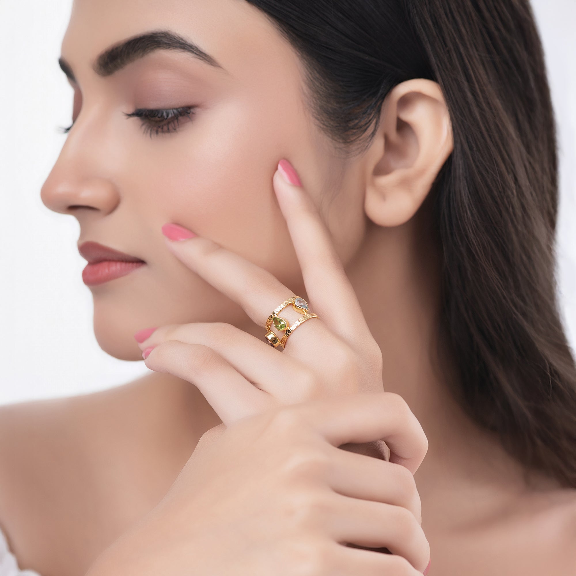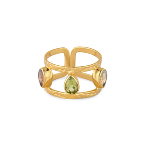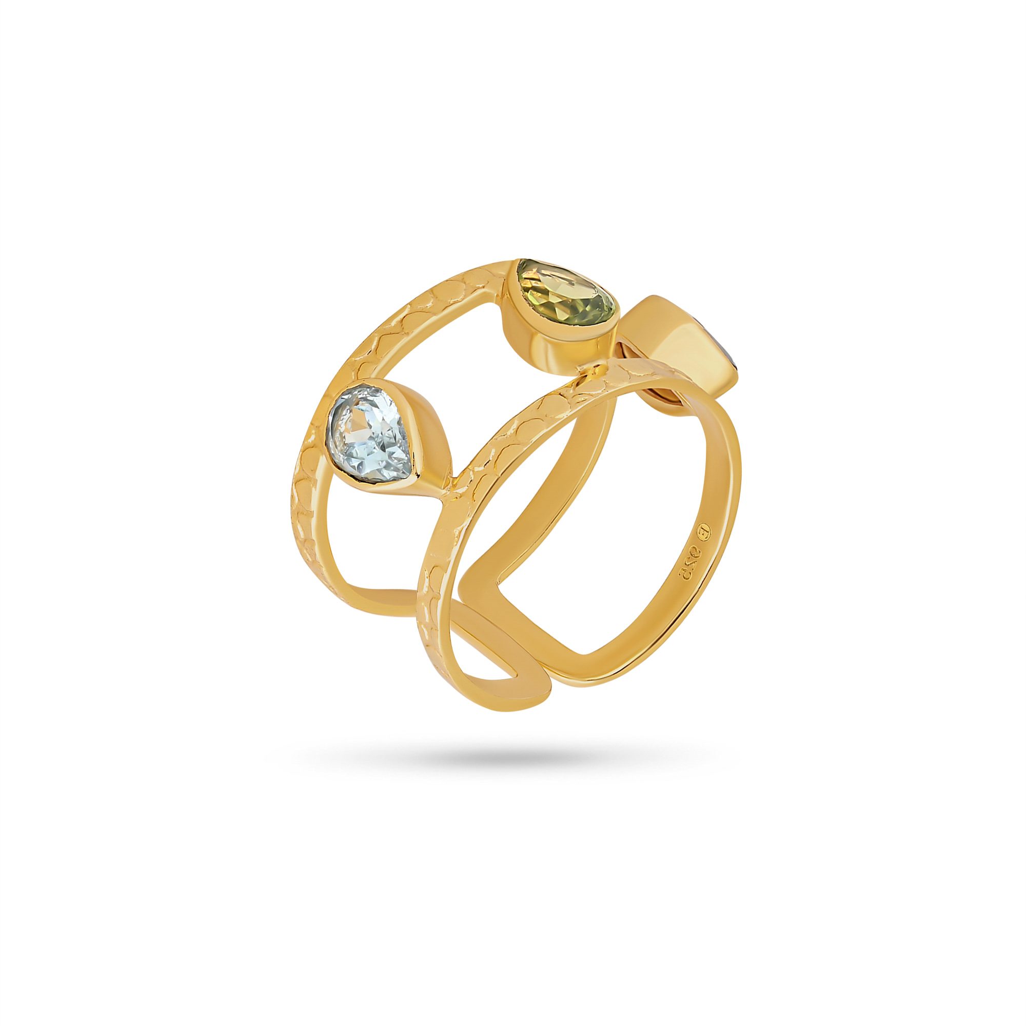 18k gold-plated ring showcasing a vibrant trio of blue topaz, citrine, and green amethyst stones—celebrating harmony and colorful elegance in perfect balance.